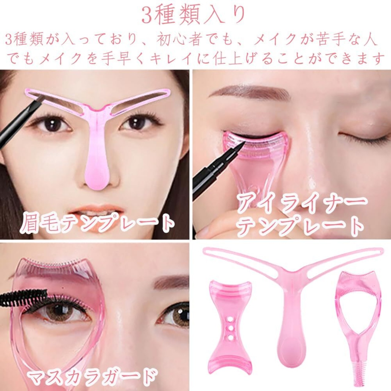 3種類入り:マスカラガード、アイライナー テンプレート 、眉毛テンプレート3種類が入っており、初心者でも、メイクが苦手な人でもメイクを手早くキレイに仕上げることができます。毎朝の化粧が楽になるし、朝のメイク時間も大幅にカットされます。メイクに欠かせないツールセットです。