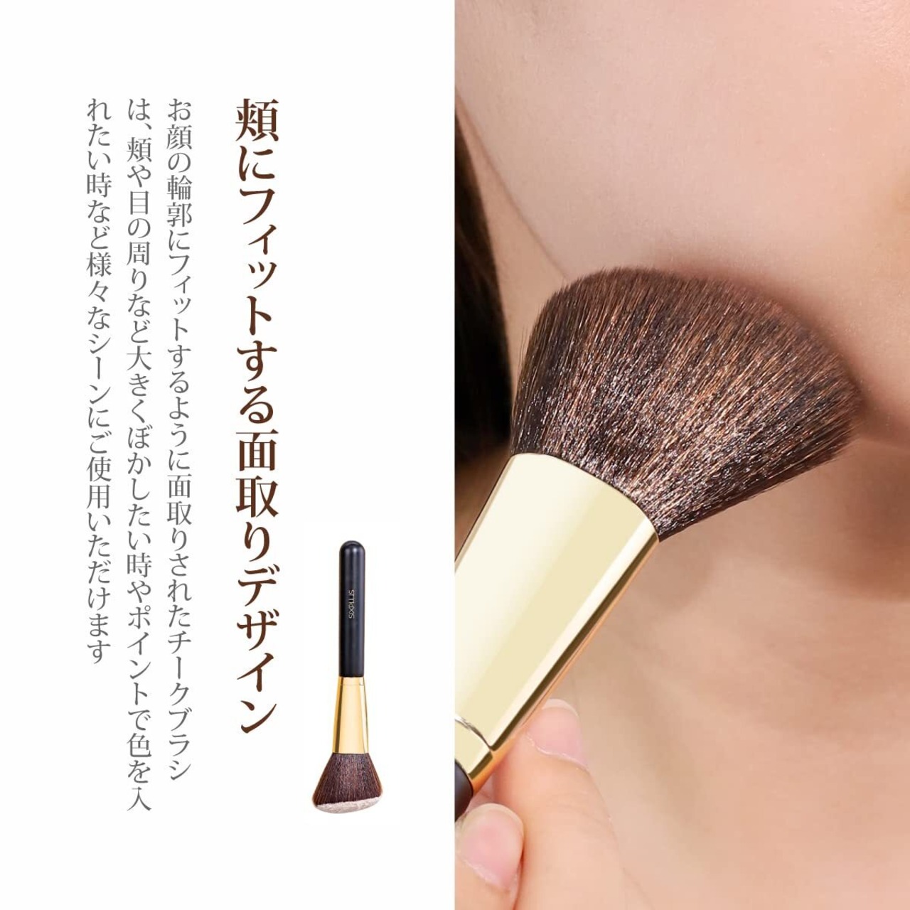 【頬にフィットする面取りデザイン】チークブラシはお顔の輪郭にフィットする面取りデザインで、小鼻や目元をより自然な仕上がりにしてくれます。 簡単にグラデーションができ、部分的にもメイクする事ができます。