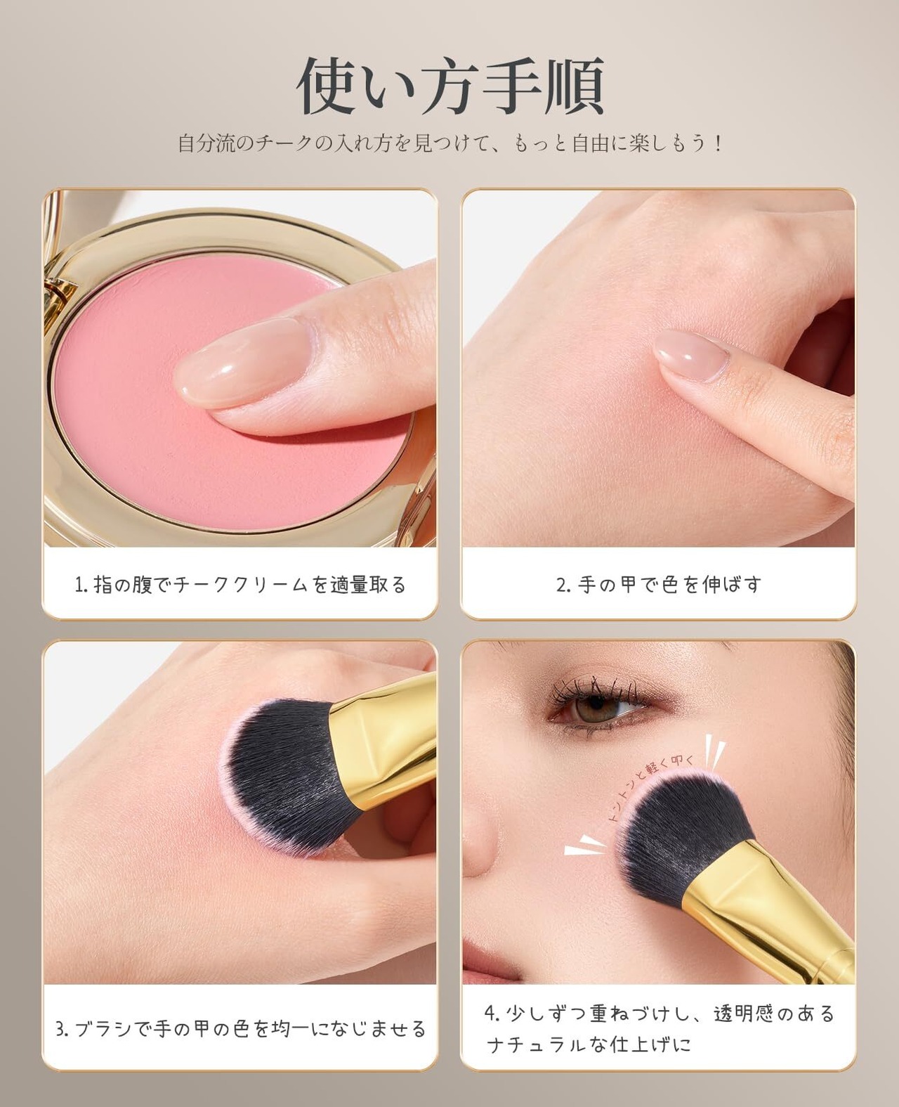 極めて均一で:良いブラシは製品を均一に広げ、肌のテクスチャーに押し込むことができ、ダマや色ムラを最大限に防ぎ、より上品で繊細な仕上がりを実現します。液体・クリーム状のチーク、コントール製品のムラのない、プロのようななめらかな仕上がりを実現。