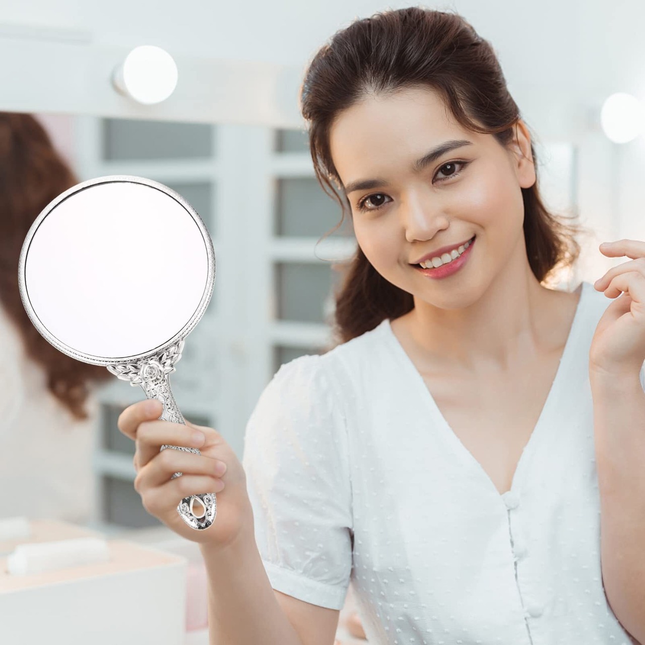 【シルバーハンドル・快適なグリップ】手鏡 コンパクトのハンドルはシルバーでデザインされており、持ち心地がよく、メイクプロセスがよりスムーズになります。