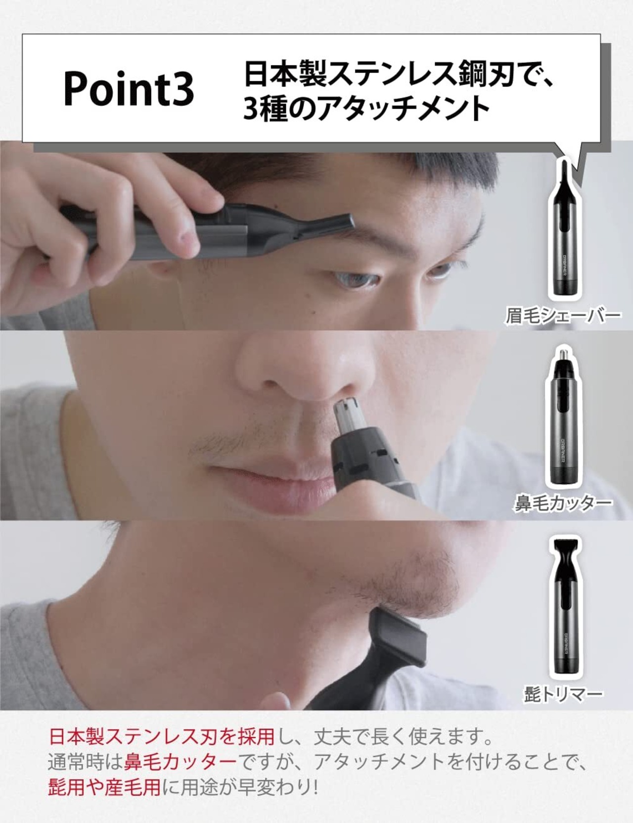 【3in1】鼻毛、ひげ、眉毛の処理を1台3役で実現。もみあげや顔そりなどの処理も可能。
