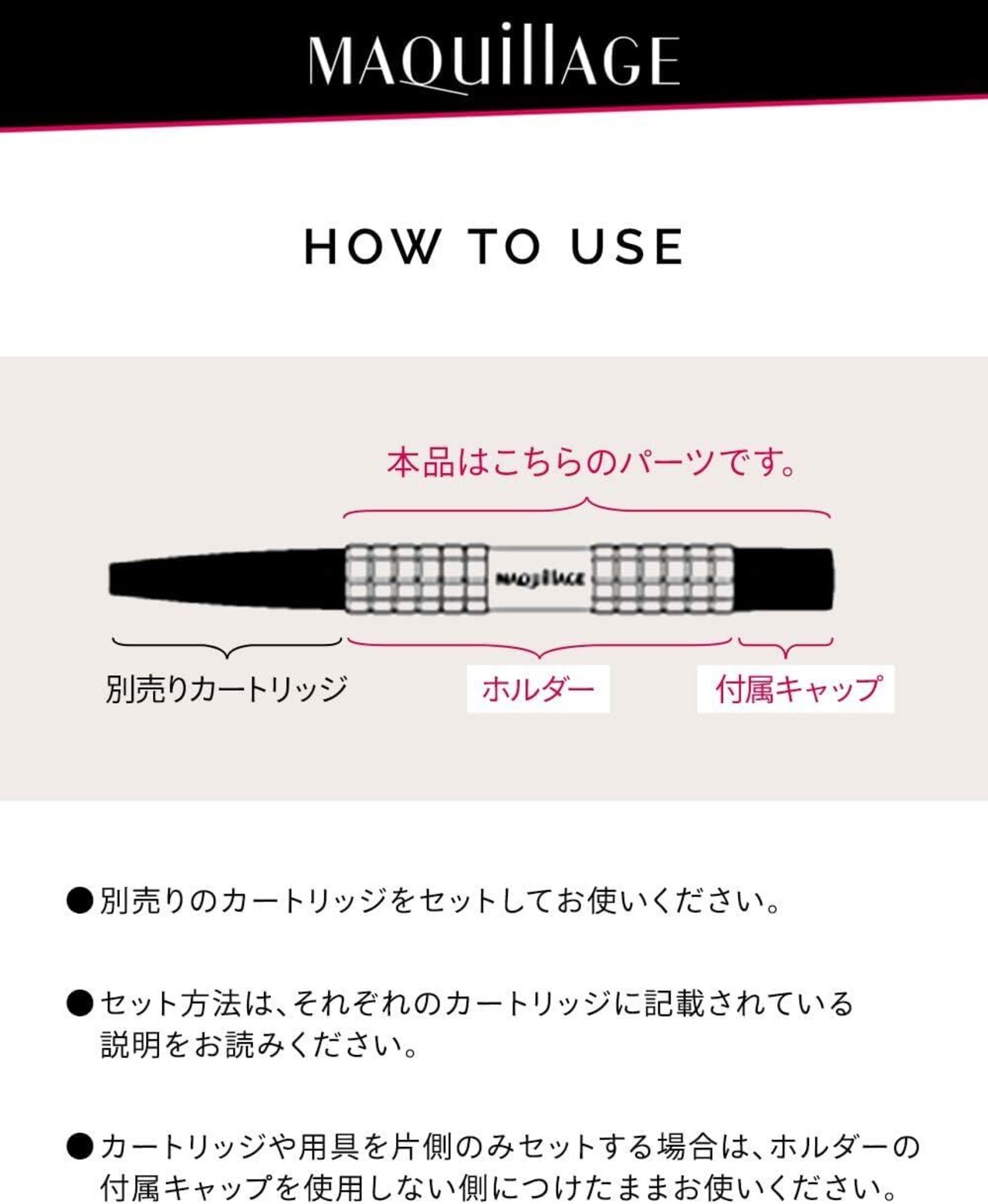 ●カートリッジや用具を片側のみセットする場合は、ホルダーの付属キャップを使用しない側につけたままお使いください。