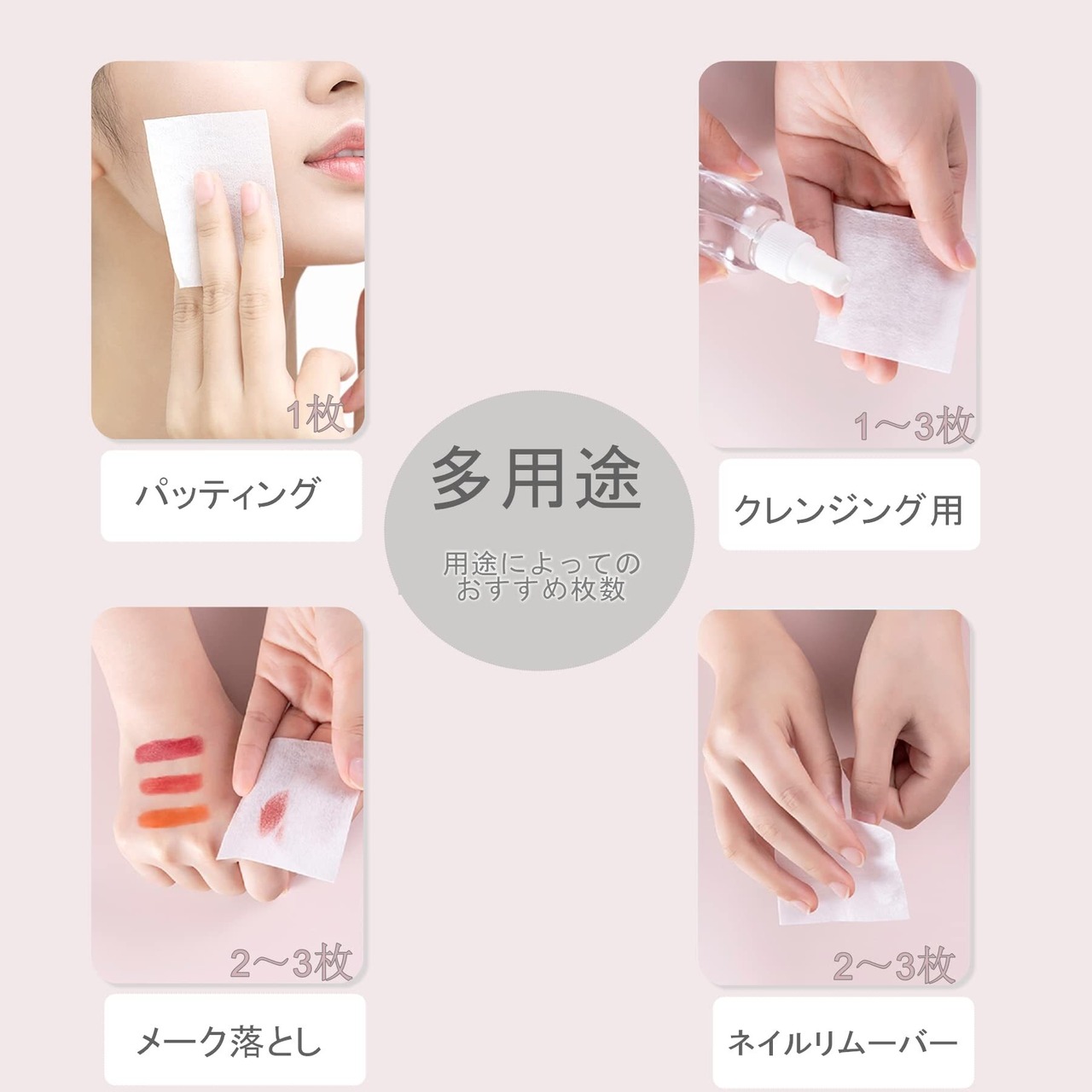 【幅広く活躍】コットンパフを使って化粧水を付けると、肌全体に均一に潤いを届けられます。額や頬など顔の 広い面だけでなく目元や口元などの細部にもなじみやすく、使い勝手が良いです。化粧水などのなじませやメイ クのふき取り、パック、ネイルオフなど、さまざまな用途に活用できます。