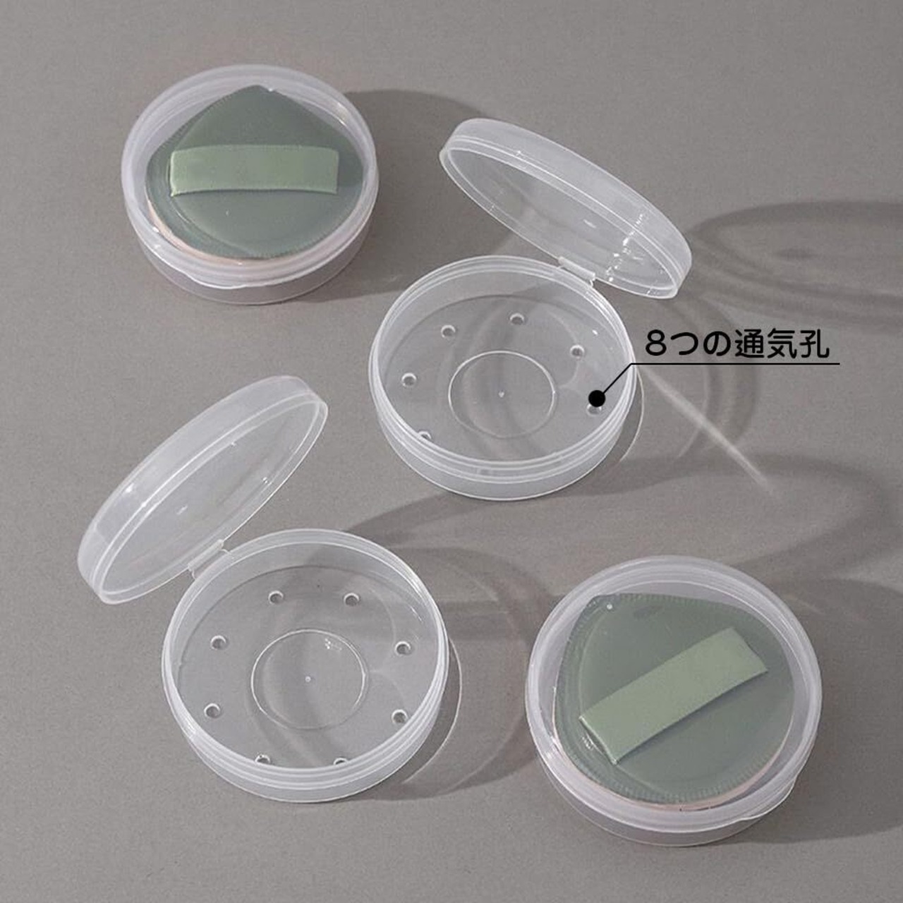 【通気性あり】底部に設けられた8つの通気孔が、内部の湿気を逃がしつつ、化粧パフを衛生的で乾燥した状態に保ちます。