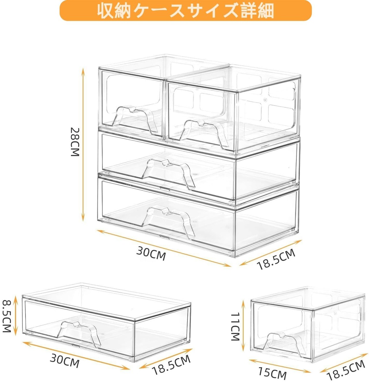 【省スペース】透明収納ボックスの寸法は幅30×奥18.5×高さ19.5cm;積み重ねてスペースを最大限に活用することも可能です。引き出し設計で、ボックス内の物をスムーズに取り出せるのが魅力です。