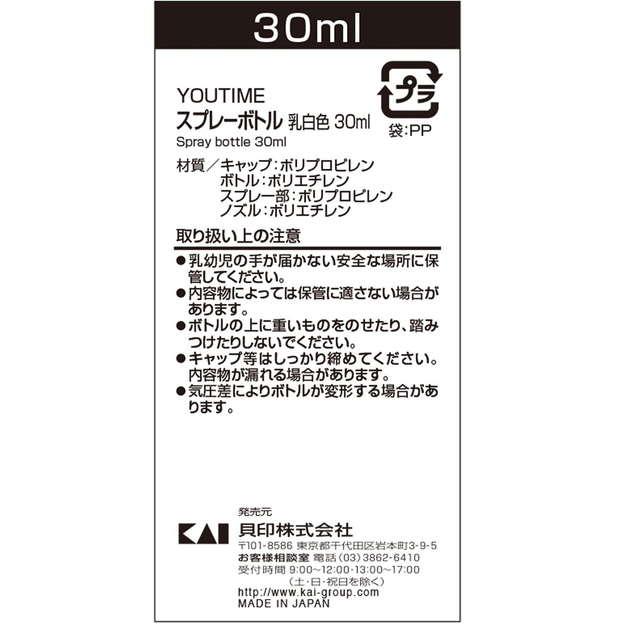 貝印(Kai Corporation) スプレーボトル 乳白色 30ml ボトル ぼとる 化粧ボトル 透明 容器 旅行 トラベル YOU TIME (化粧水・香水等の使用に) 1個