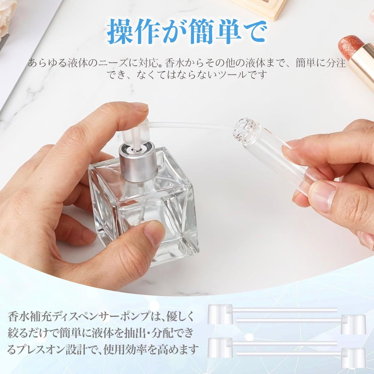 【あらゆる液体に多用途使用】香水はもちろん、アロマオイル、化粧水、トナー、メイクアップリムーバーなど、様々な液体の詰め替えに。自宅の化粧台からプロの美容室まで、幅広いシーンで活躍します。
