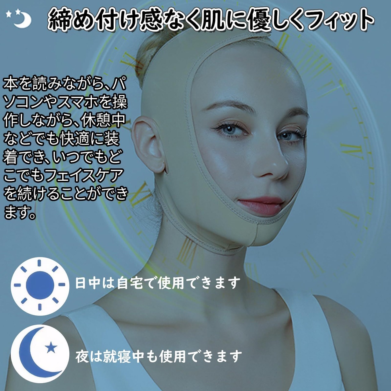【多様なシーンで使用可能】フェイスバンド薄くて通気性があり、肌にやさしくフィットするため、本を読む時、パソコンやスマートフォンを使う時、または休憩中でも快適に着用でき、いつでもどこでも小顔ケアを続けることができます。