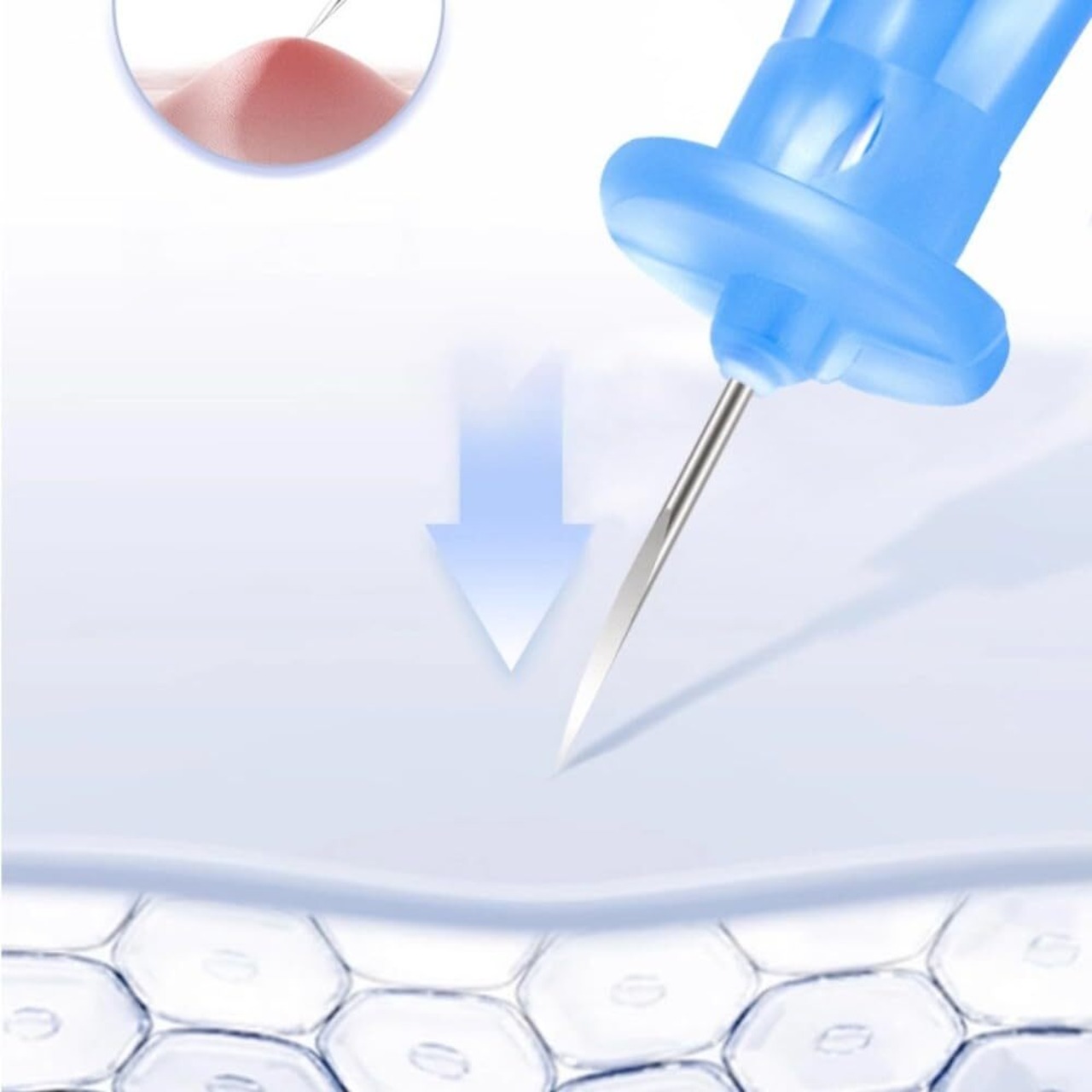 【傷跡最小限のピアッシング】細身で尖った形状が、皮膚表面への負担を最小限に抑え、スムーズなシミ・黒ずみ取りをサポート。美肌を損なう赤みや腫れを防止します。