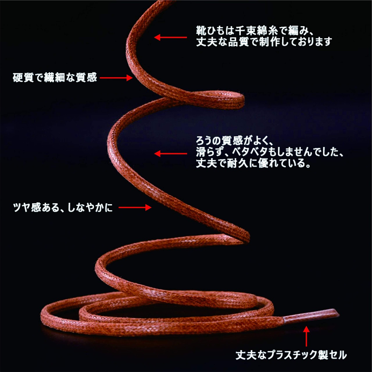 [丈夫なプラスチック製セル] アイレットを滑らかにひも通すためのプラスチックの先端があります、つけてみると違和感なく靴の雰囲気にマッチしました。細部までこだわる方には是非使っていただきたい一品です。靴紐の先端に付けられたセルは、プラスチック材を丹精込めて丁寧に取り付けています。割れにくく丈夫です、紐穴に通すのもスムーズです。