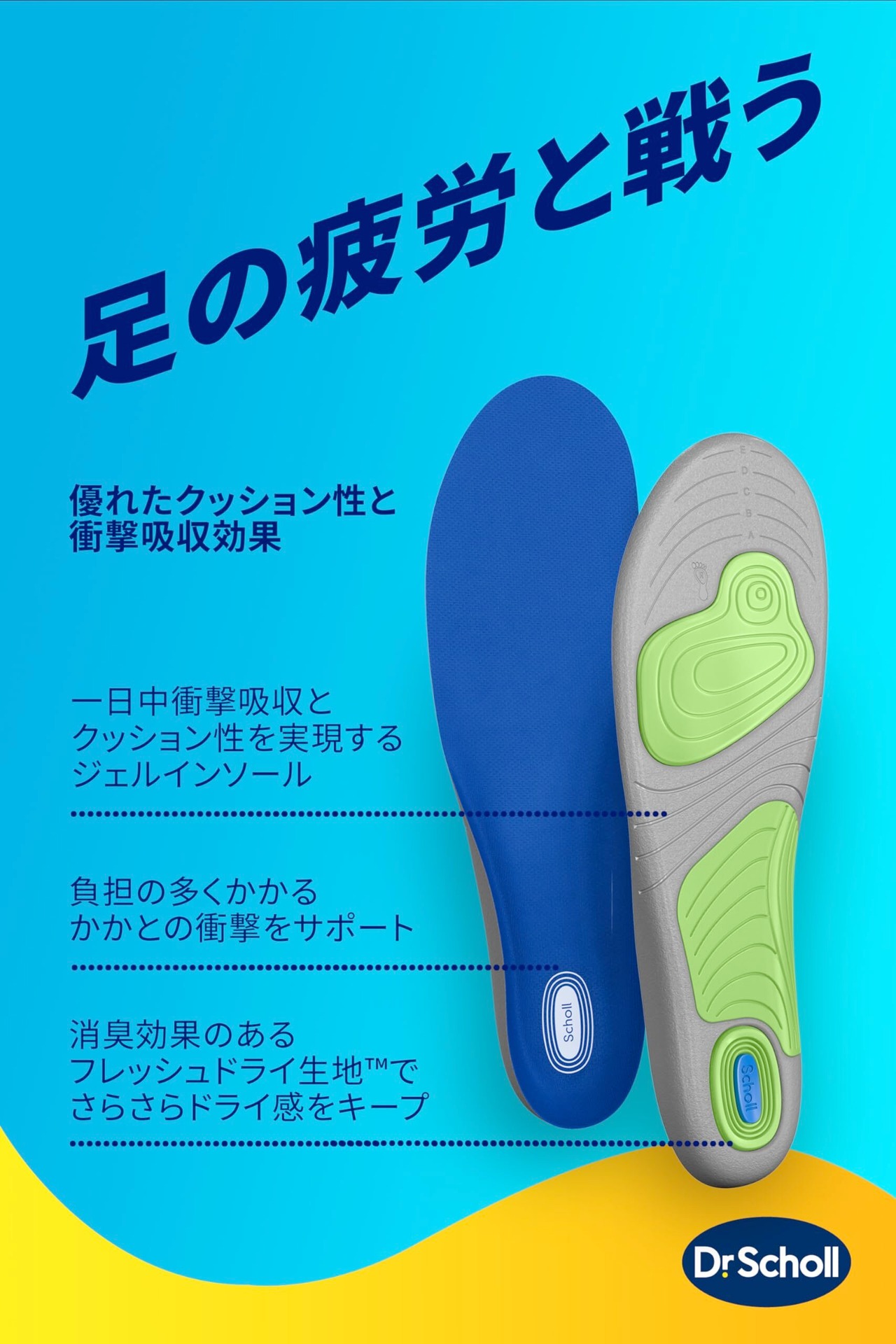●インソールをお使いの方は、ご使用のインソールを取り外し、ドクター・ショールジェルアクティブ™インソールをジェルの面を下にしてご使用ください。インソールが磨り減っている時は交換してください。6ヶ月毎の交換をお勧めします。