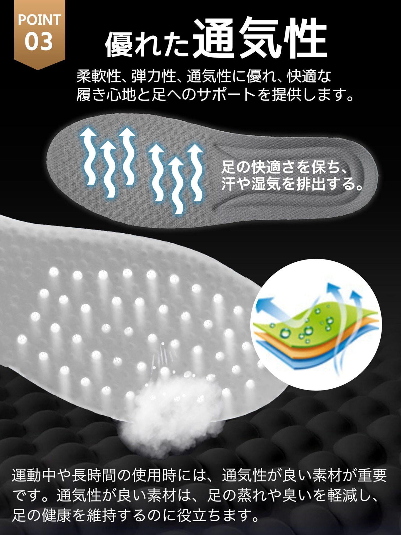 【衝撃吸収】衝撃吸収を高反発素材を全面に採用。特に衝撃がかかる踵だけでなく、足全体に高い衝撃吸収性と反発性を発揮し、ランニングやトラッキング、フィットネスジムでの運動など、アクティブなスポーツに最適な素材です。抜群のクッション性を実現しています。【衝撃吸収・疲労軽減】 表面に優しい履き心地のソフトクッション、裏面には衝撃吸収ジェルパッドを搭載、生卵を受け止められる衝撃吸収力に加え、疲労感を軽減する3Dサポートが、土踏まずを支えることで体圧を分散し足の疲れや痛みを軽減します