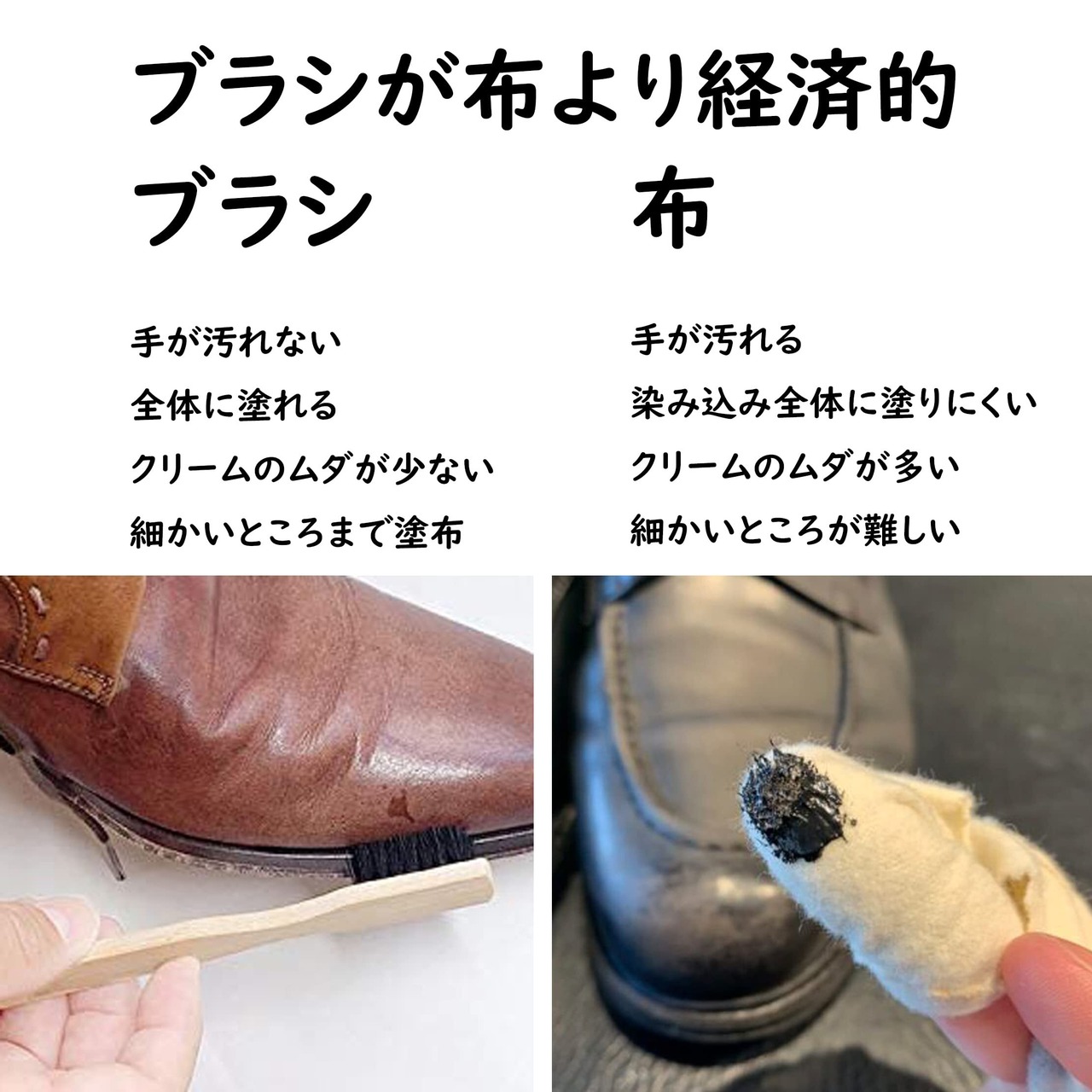布での塗布 ブラッシングよりブラシの方がクリームを全体的にまんべんなく伸ばしやすい。手を汚さずに効率的に作業ができる。コバの部分やメダリオン、革のシボ(シワ)など布では届かない部分までクリームを塗り、詰らない様にかき出す事ができる。布にクリームを取ると布自身にクリームが吸収されてしまい適量を確実に塗ることができない。