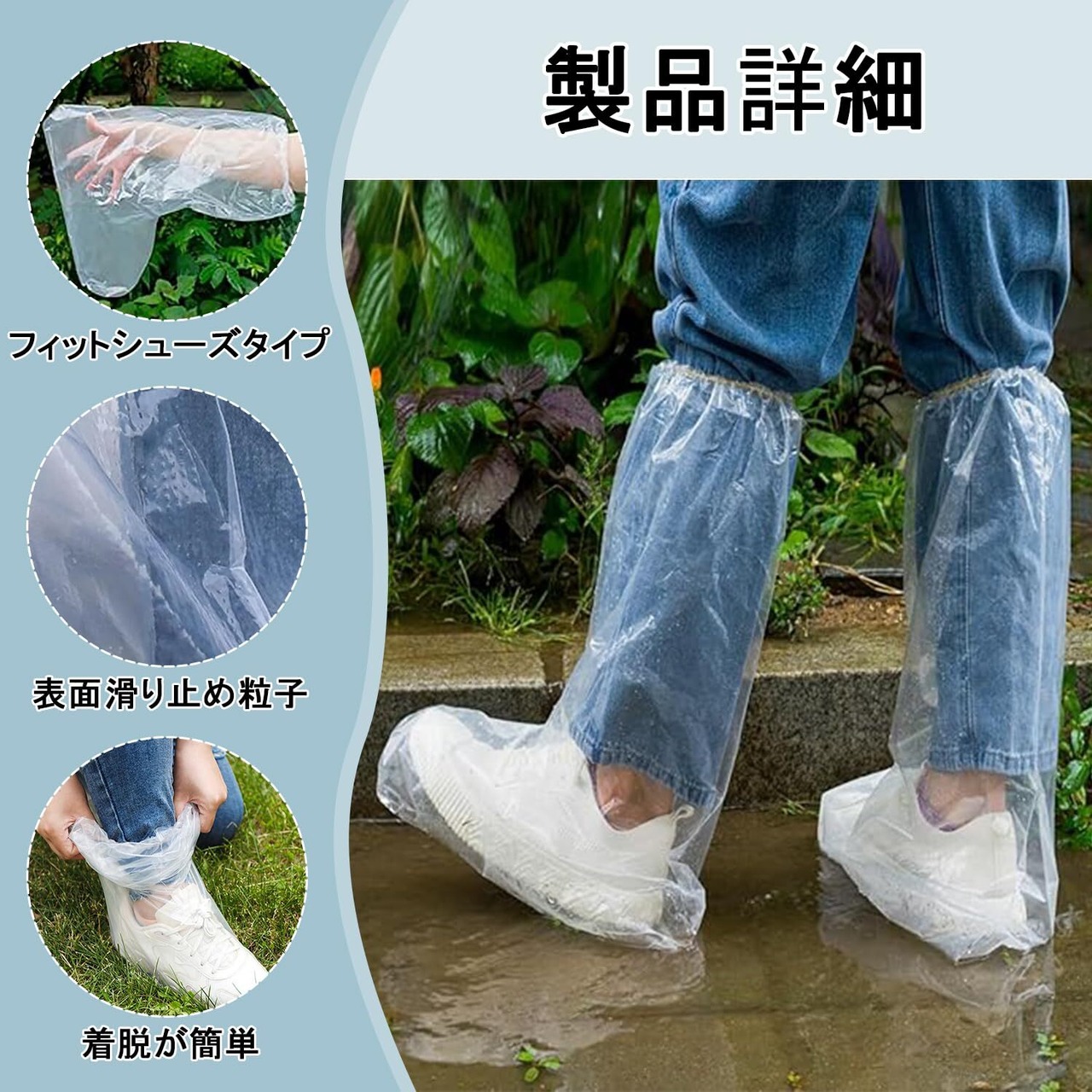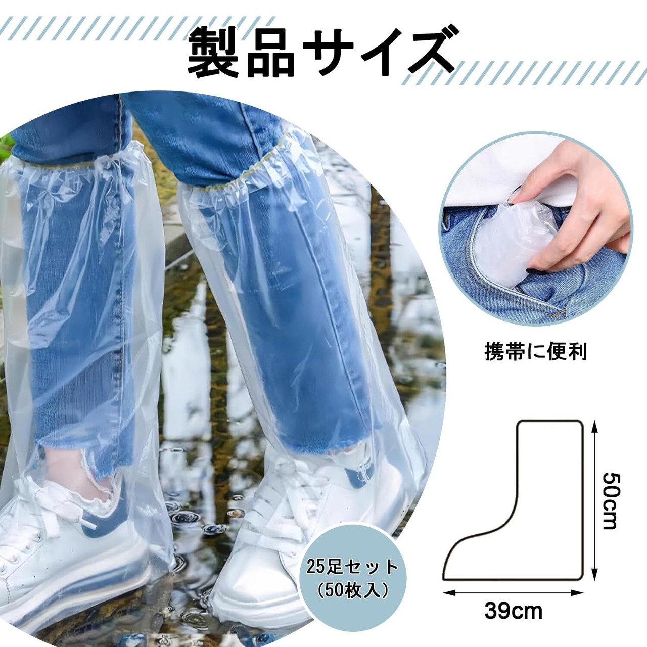 【形状を改良】内容量:25足セット(50枚入)。重量:36g/2枚(1足)。防水 靴カバーは縦約50cm×横37cmの膝下までの長い丈に加え、足元は靴型の形状に改良しました、水や汚れなどをしっかり防ぎます!突然の雨でも、大切な靴をしっかり守ります。