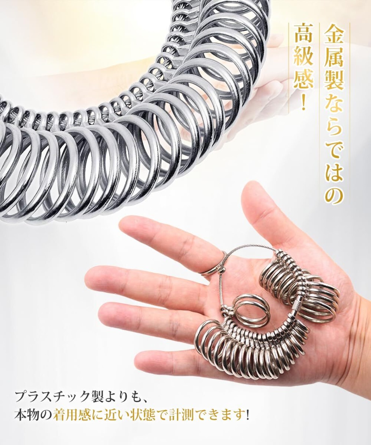 測定時のご注意:リングゲージ 自体の重さで 指 と ゲージ の間に隙間ができ、実際の サイズ より緩くなる場合があります。測定時には、ワイヤーから外すかや手のひらに接地させてお測り下さい。指輪を着ける指の腹より第二関節が太い方は、関節が無理なく通るサイズが適正なサイズとなります。体調などで指のサイズが変化することがございますので、朝夕それぞれ1回ずつ測定してください。