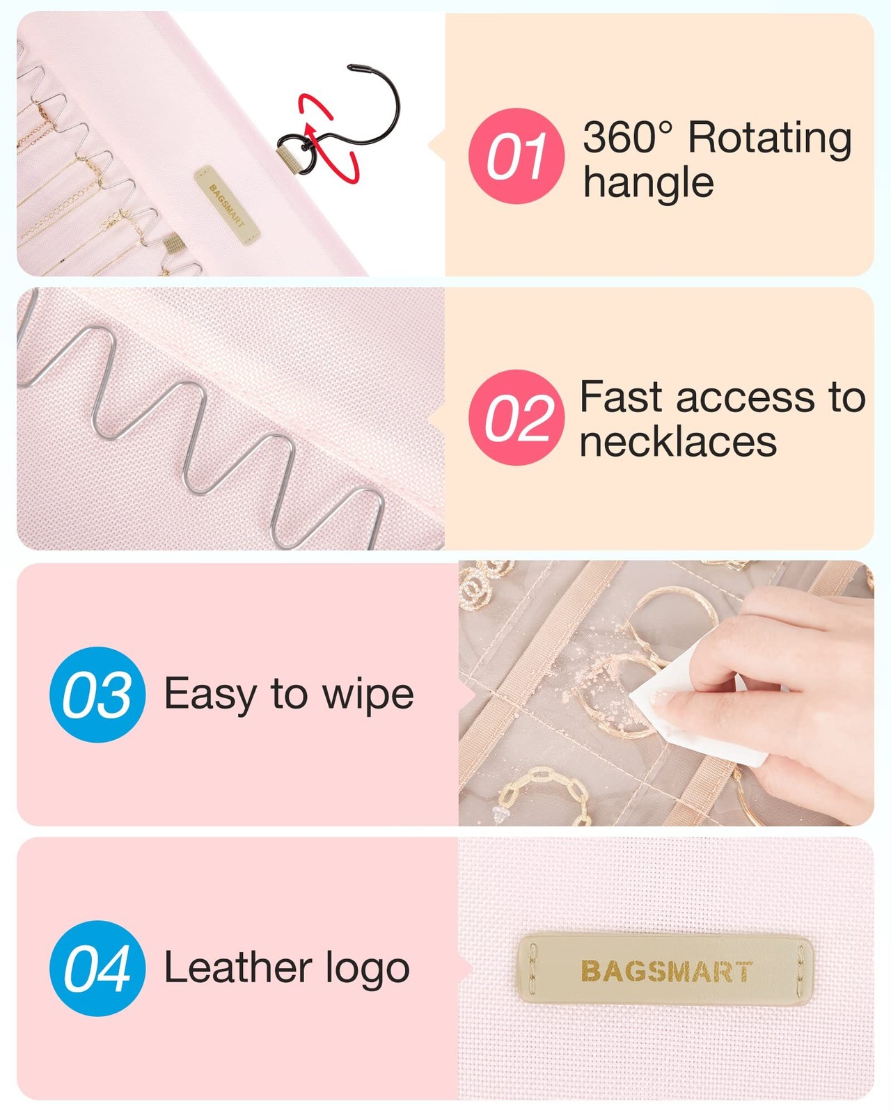 BAGSMART 吊り下げジュエリーオーガナイザー 収納ロール ハンガー付き メタルフック 両面ジュエリーホルダー イヤリング ネックレス クローゼットのリング 壁 ドア Mサイズ ピンク
