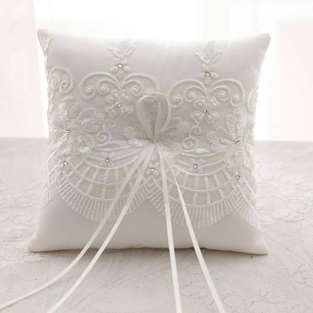 [misaki] リングピロー 完成品 レース刺繍 花 パール リボン リングピロー ウエディング 結婚式小物 (15X15cmビーズ)