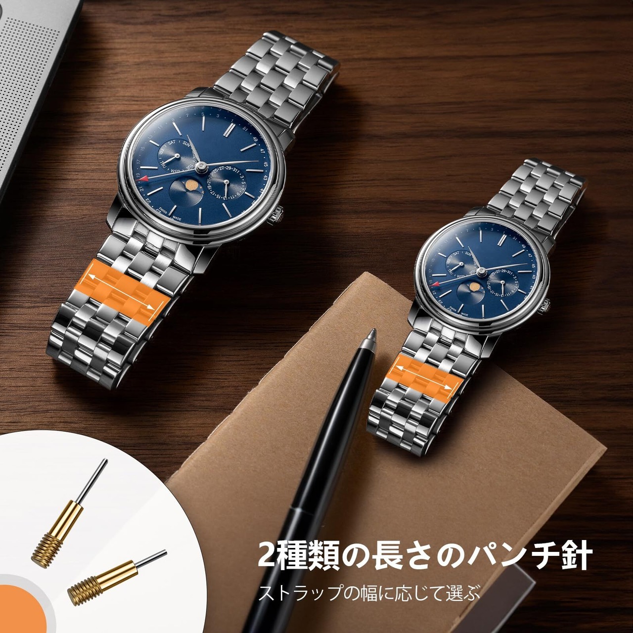 【パンチピン用交換針9本】キットには、2種類の長さの交換用針があります。 ほとんどのストラップでは、短いパンチピンのヘッドを使用するだけでストラップリンクピンを取り外すことができます。 幅の広いストラップの場合は、長いパンチピンを使ってストラップピンを少し押し出すと、簡単に取り外すことができます。