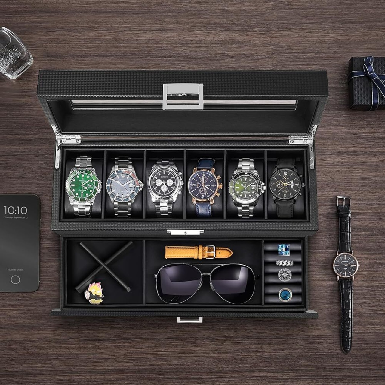 Anyasun 腕時計ケース 6本 腕時計収納ボックス 高級 時計 コレクションケース カーボンファイバー仕上げ 男女兼用 インタリア用 レザー製クッション 鍵付き (G:2段式・6本+小物整理(ブラック))
