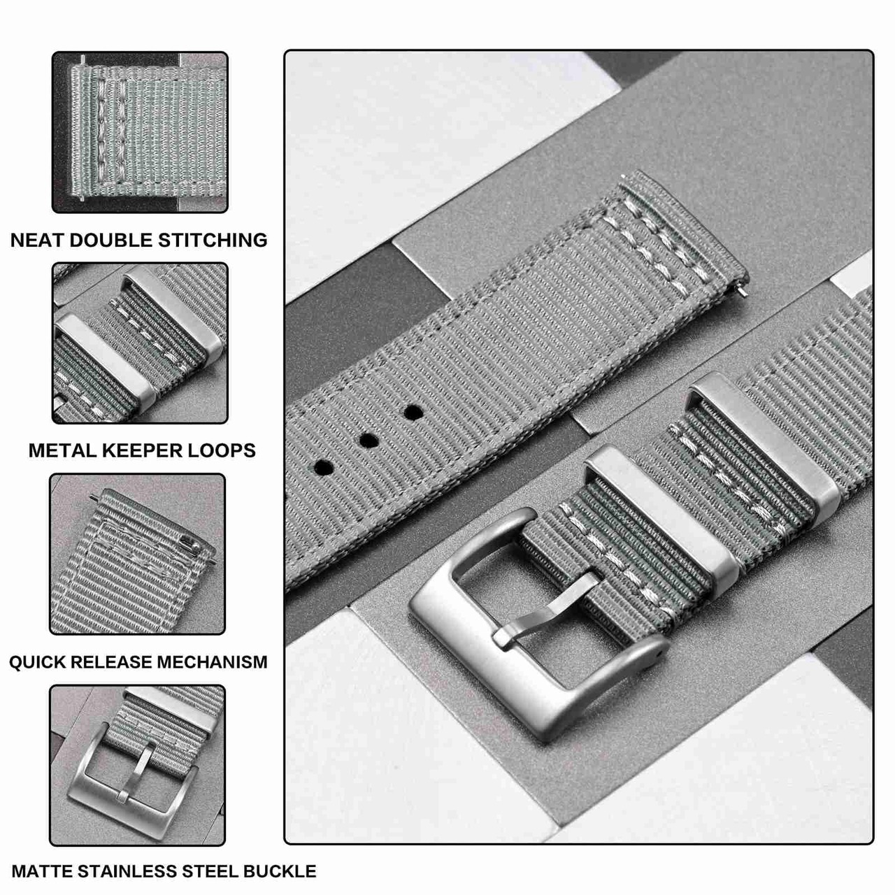 ツーピース・クイックリリース・デザイン: このナイロン製時計バンドは、便利なツーピース・クイックリリース機構を備えており、工具を使わずに簡単にストラップを交換することができます。