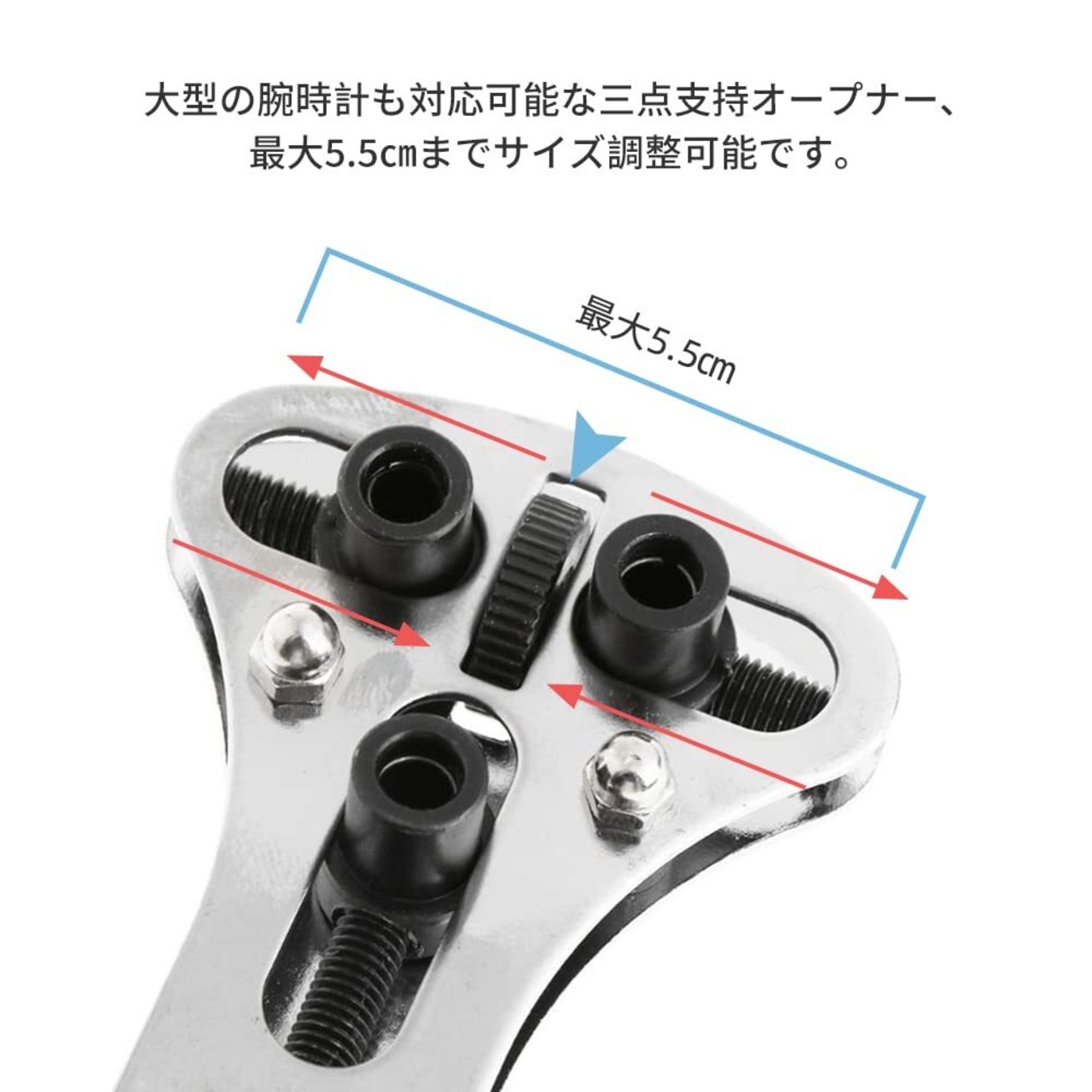 大型の腕時計も対応可能な三点支持オープナー、最大5.5㎝までサイズ調整可能です。