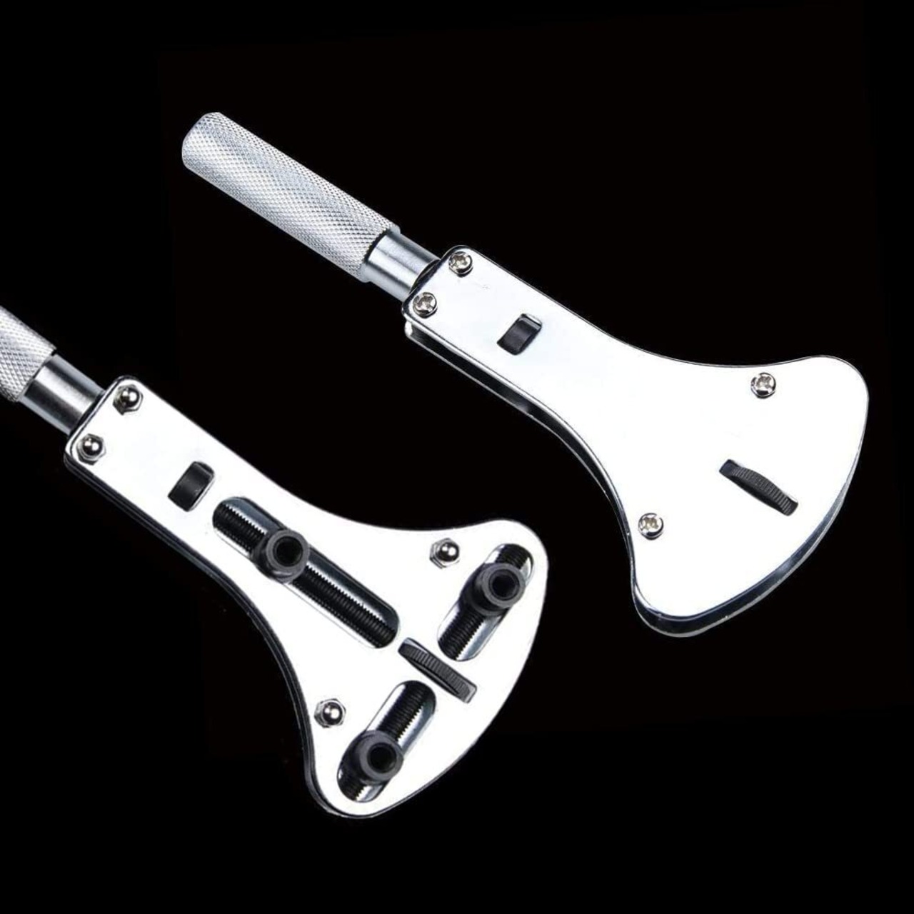 時計の大きさに合わせてオープナーのネジを回して調整することで裏蓋をきっちり固定できます。台座にセットすれば安定した状態で作業が可能です。
