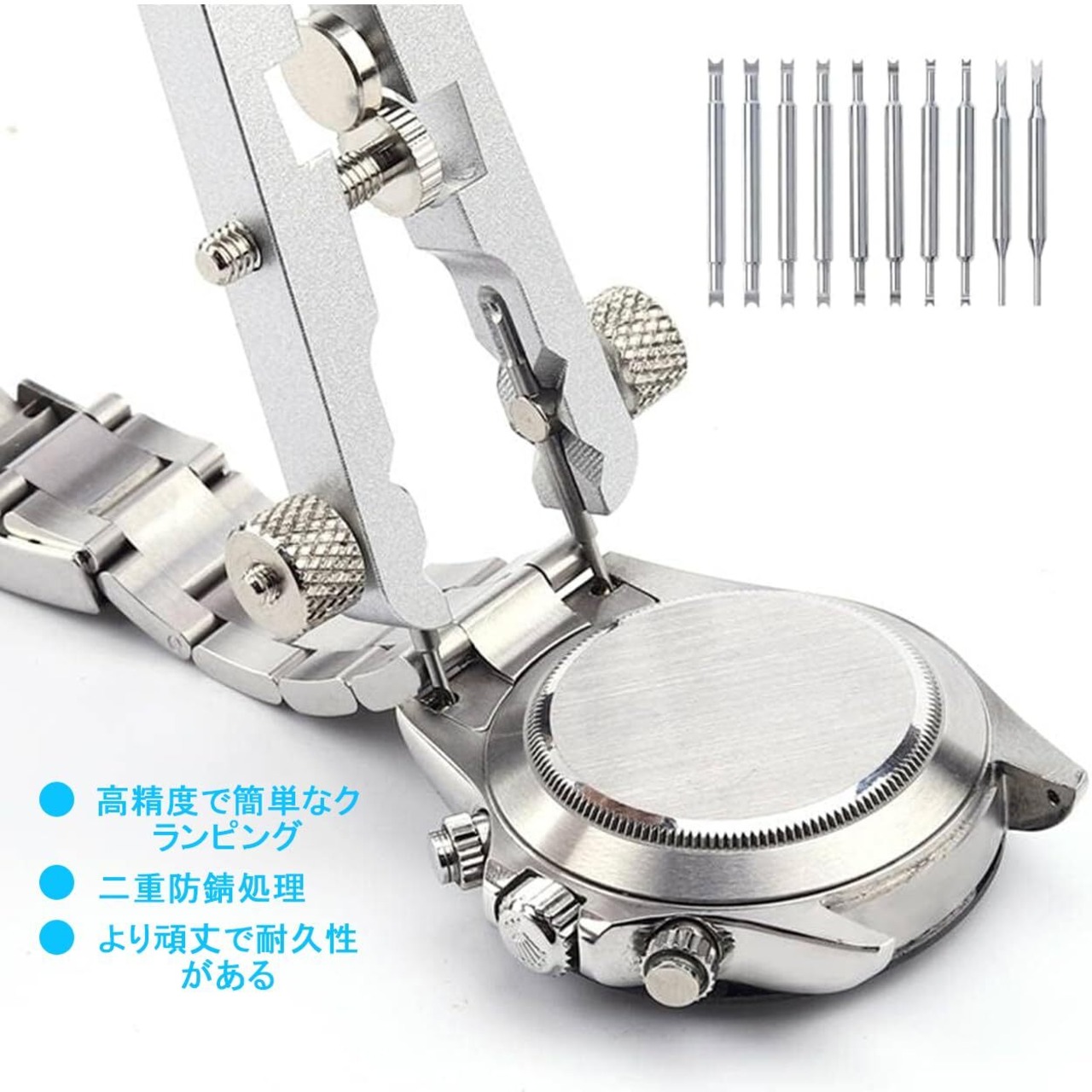 【多機能アクセサリー】交換可能なユニバーサルピンフォークヘッドが10本付属しており、さまざまなタイプやサイズの時計バンドに適応します。