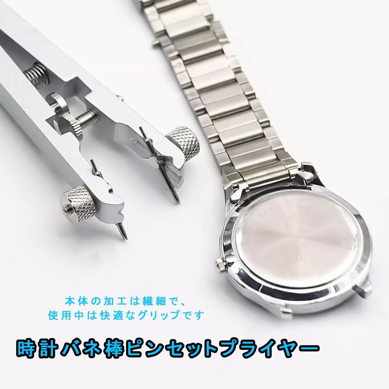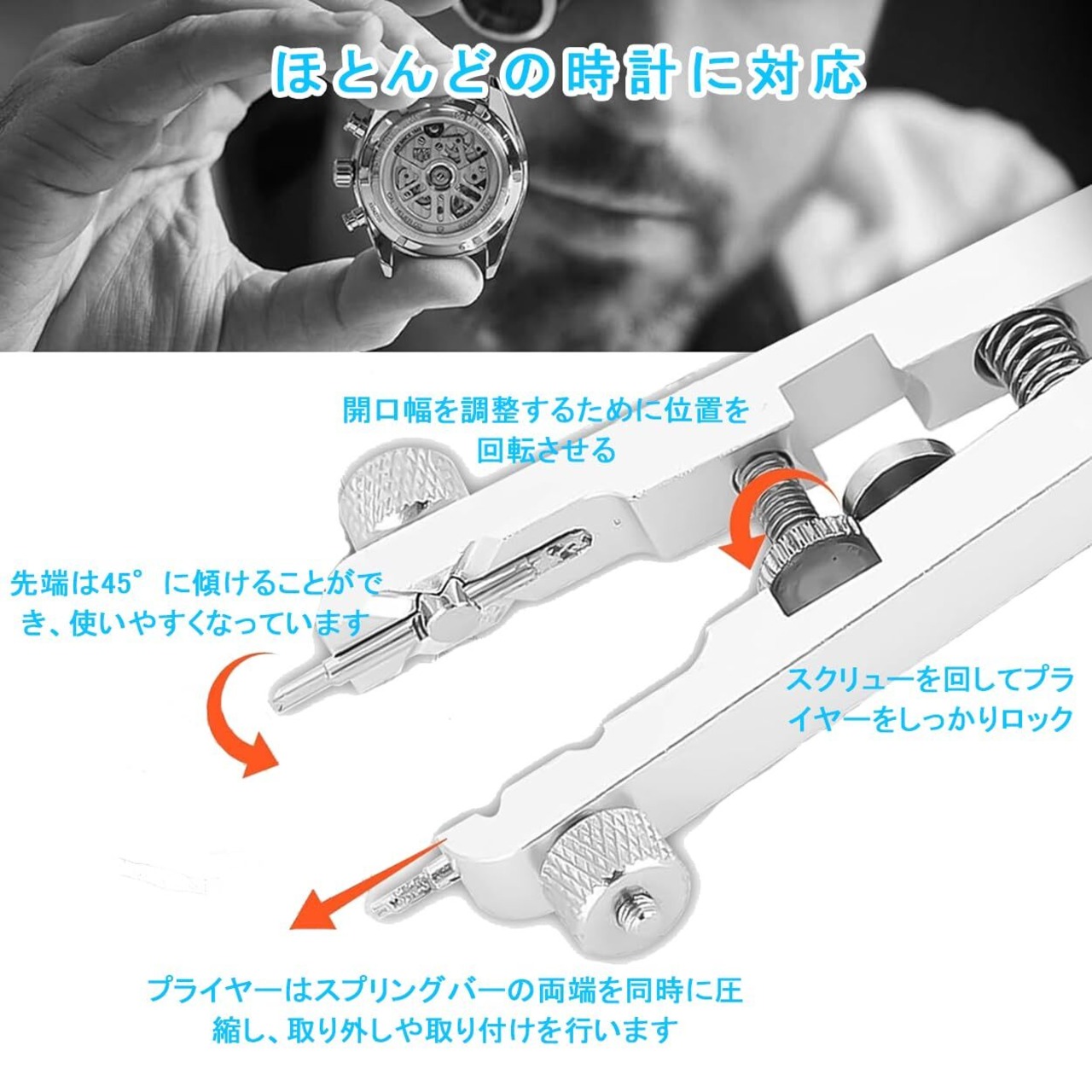 【ダブルクリップデザイン】この時計修理ツールは、ダブルクリップデザインを採用し、時計のスプリングバーの取り外しや取り付けに特化しています。バンドの取り外し、ブレスレットの長さ調整、個性的なバンドの交換など、精密に操作でき、時計を損傷することはありません。
