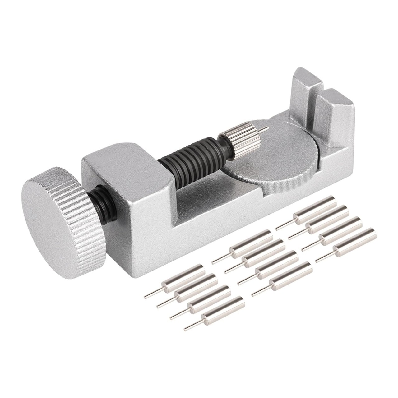 専門の腕時計ベルト調整ツール - この時計ベルト調整工具キットには、金属製の時計バンドリムーバーと12個の予備ピンが付属しています。腕時計のベルト調整や修理に最適なツールです。