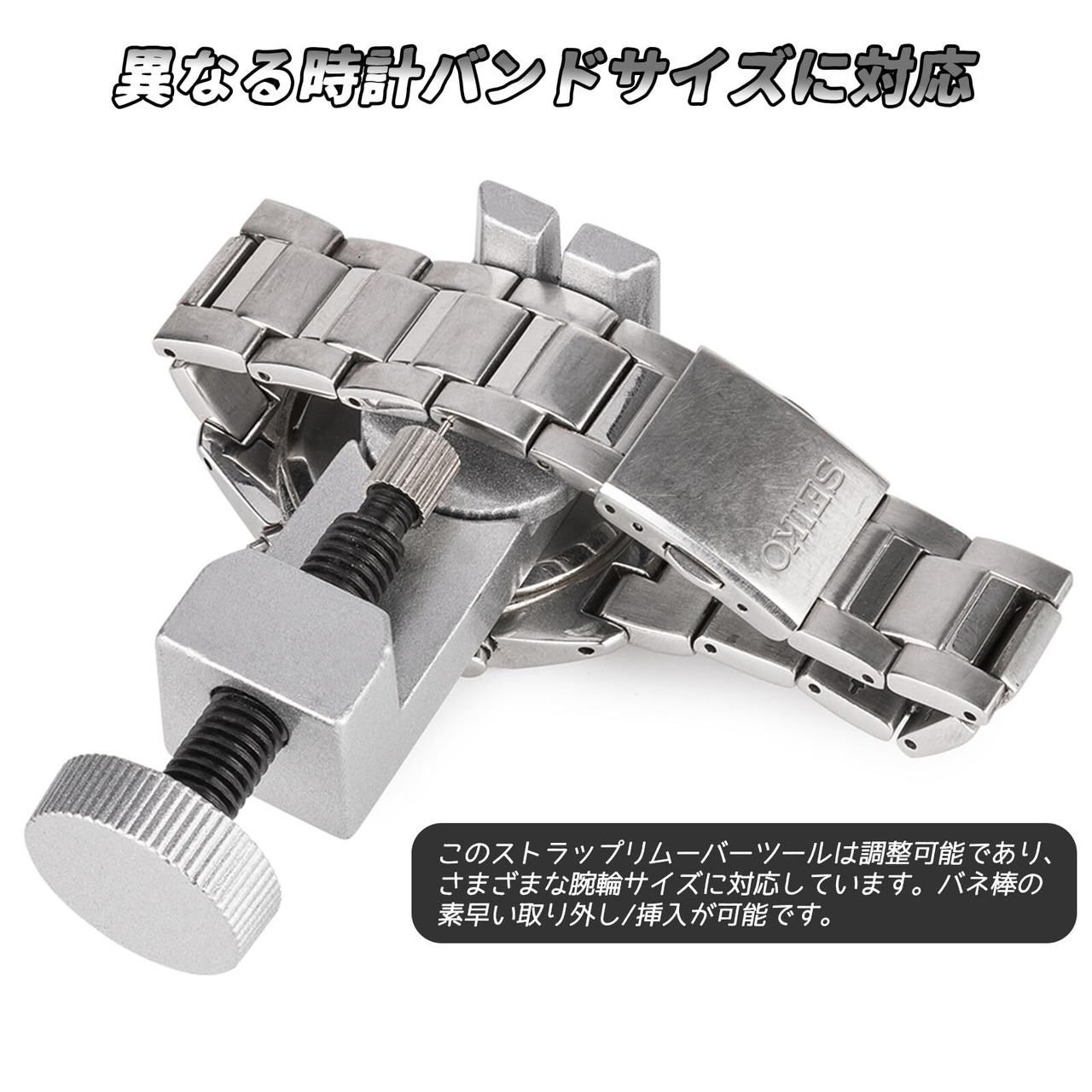異なる時計バンドサイズに対応 - このストラップリムーバーツールは調整可能であり、さまざまな腕輪サイズに対応しています。バネ棒の素早い取り外し/挿入が可能です。さまざまなバンド交換や他の時計修理プロジェクトに広く使用されています。