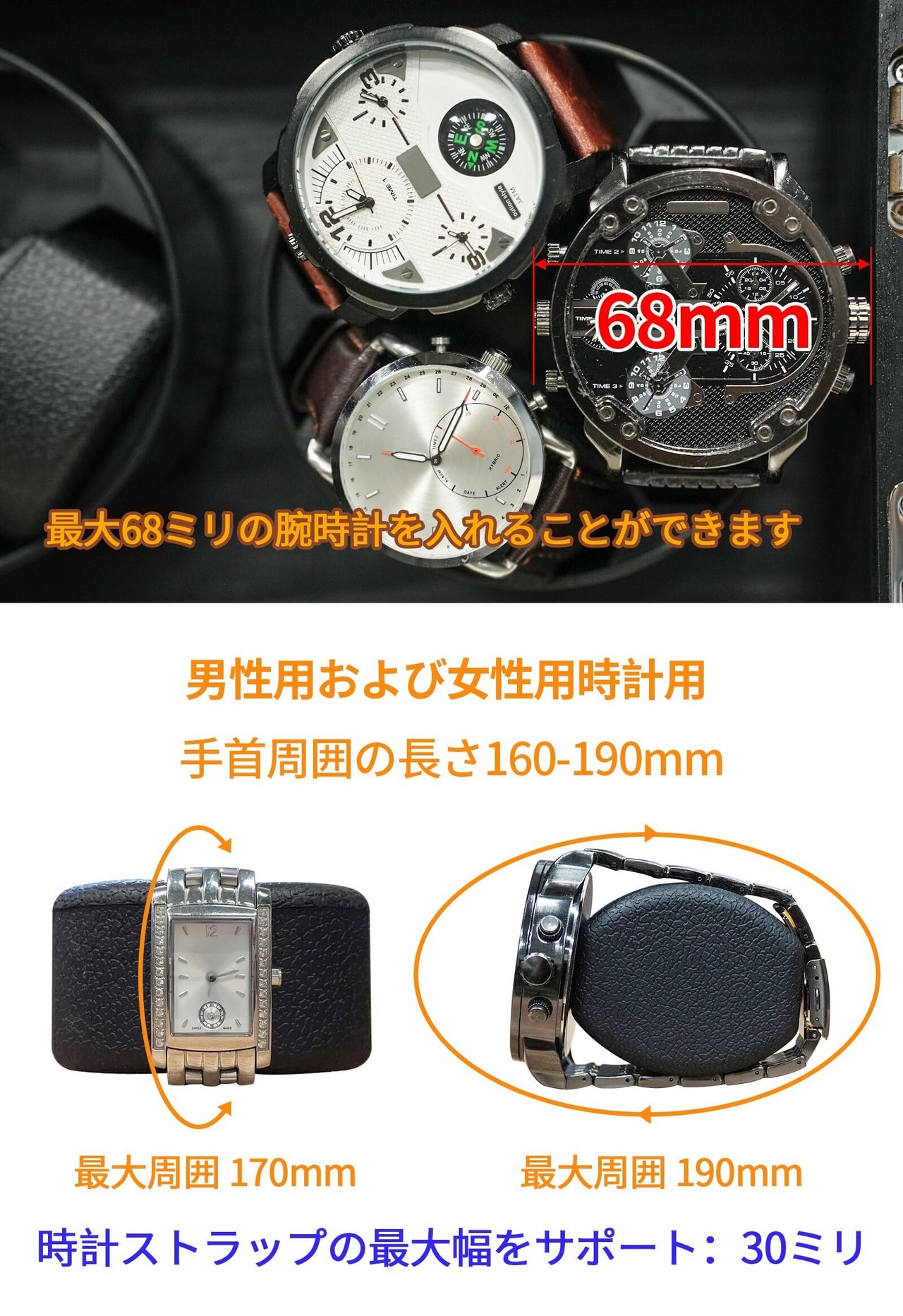 柔軟な腕時計枕、大型時計対応:時計枕の周囲は160-190 mmです。腕時計の枕は男性と女性に似合う腕時計です、それは99 %以上の自動機械式腕時計に合います。それは、最大で68 mmの表面で大きな腕時計と互換性を持つことができます。ベルト幅:30ミリ。