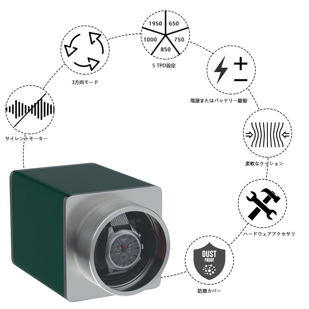 【TPDと3つの回転モード】DUKWIN ワインディングマシーンは、5TPD(1日の回転数)設定を提供し、650、750、850、1000、または1950に対応しています。ご愛用の時計の最適な設定モードに合わせて選ぶことができます。さらに、3つの回転モードがあり、時計を時計回り、反時計回り、または交互に動かすことができます。