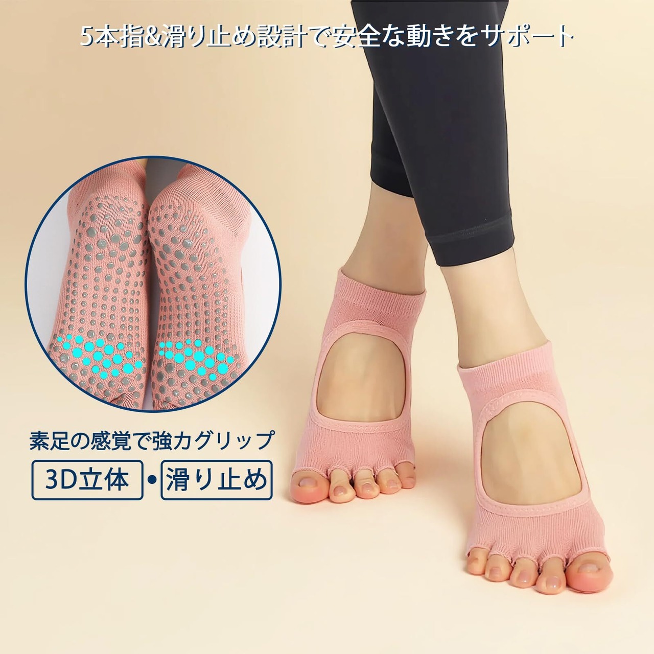 【5本指デザインで自由な動きを実現】 五指独立デザインにより足指がしっかり広がり、安定感を向上させます。5本指ヨガソックスが指の間まで汗を吸収し、蒸れを防止。血行を促進し、足先まで温かさを保ちます。しっかり床を捉え、安定した姿勢をサポートします。