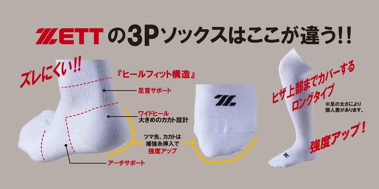 かかとズレを防ぎ、フィット感アップ。つま先とかかと部分に補強糸を加え耐久性をアップ。さらに丈はロングタイプの長尺仕様。ソフトな風合いと伸縮性に優れたベースボールカラーソックス。お買い得の3足組
