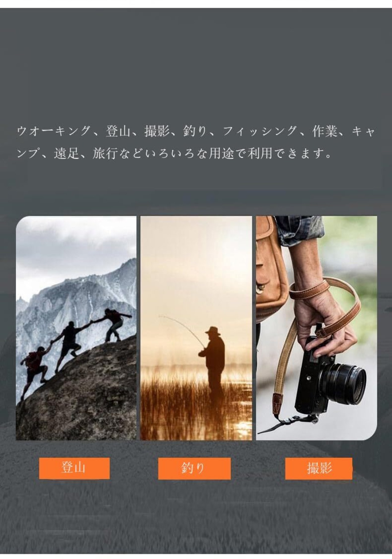 アウトドはもちろん、旅行や休日も気軽に着用できます。ウオーキング、登山、撮影、釣り、フィッシング、作業、キャンプ、遠足、旅行などいろいろな用途で利用できます。機能性にもしっかりこだわった一枚に仕上げています。