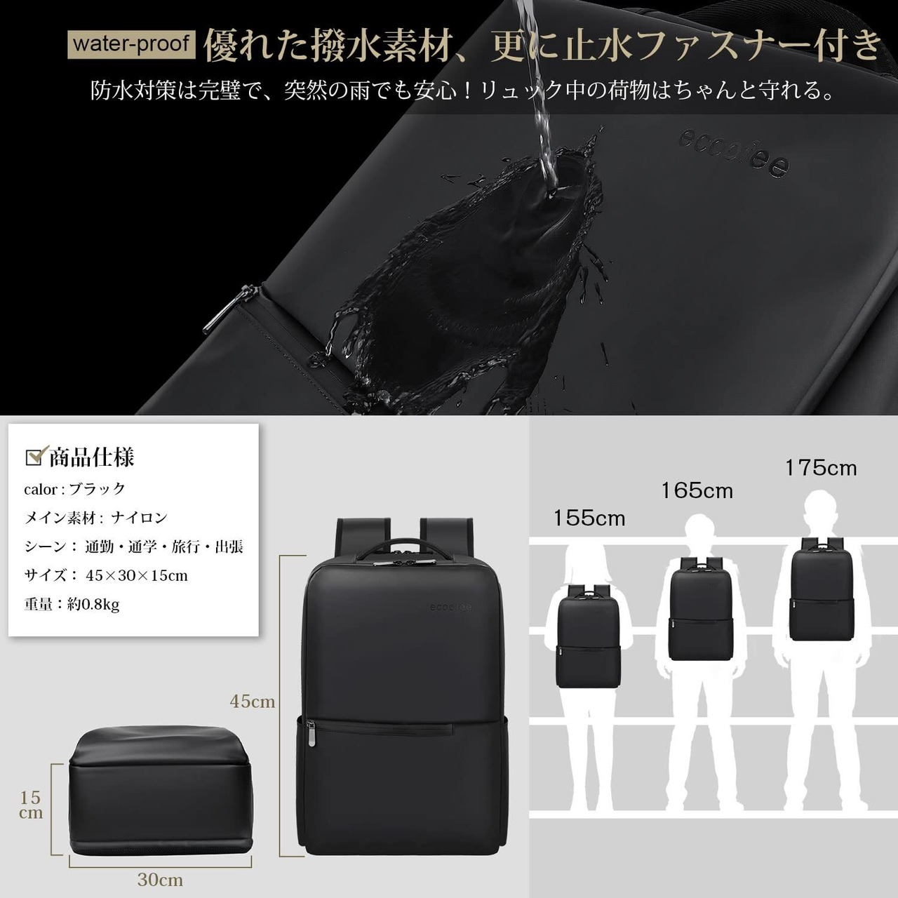 [ecoofee] リュック ビジネスリュック メンズ 防水 15.6インチ PCリュック 止水ファスナー 軽量 リックサックメンズ 大容量 A4収納可 通勤 バックパック 薄型 高校生 通学 出張 旅行 防災 男女兼用