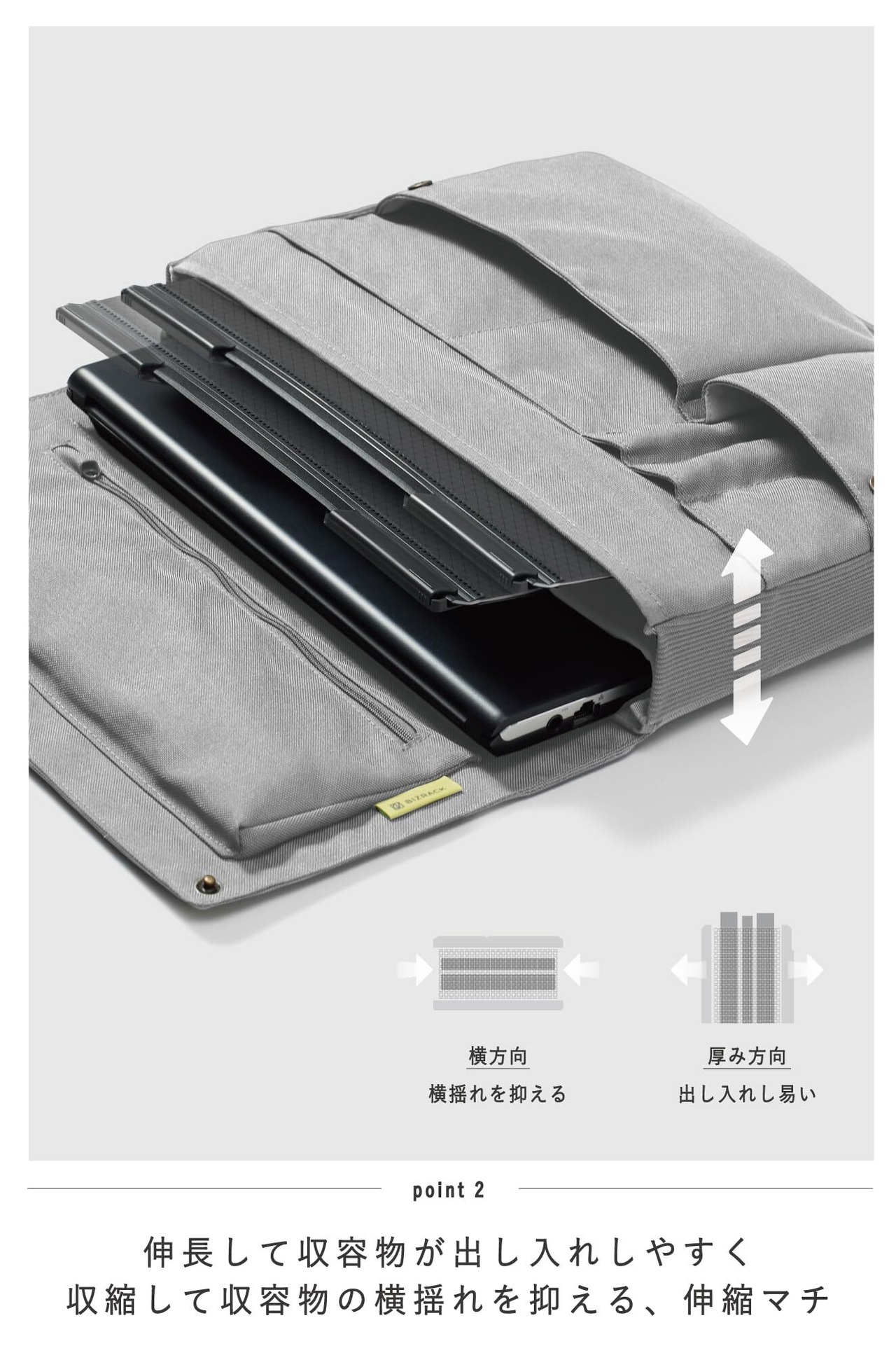 POINT2:伸長して収容物が出し入れしやすく、収縮して収容物の横揺れを抑える、伸縮マチ。