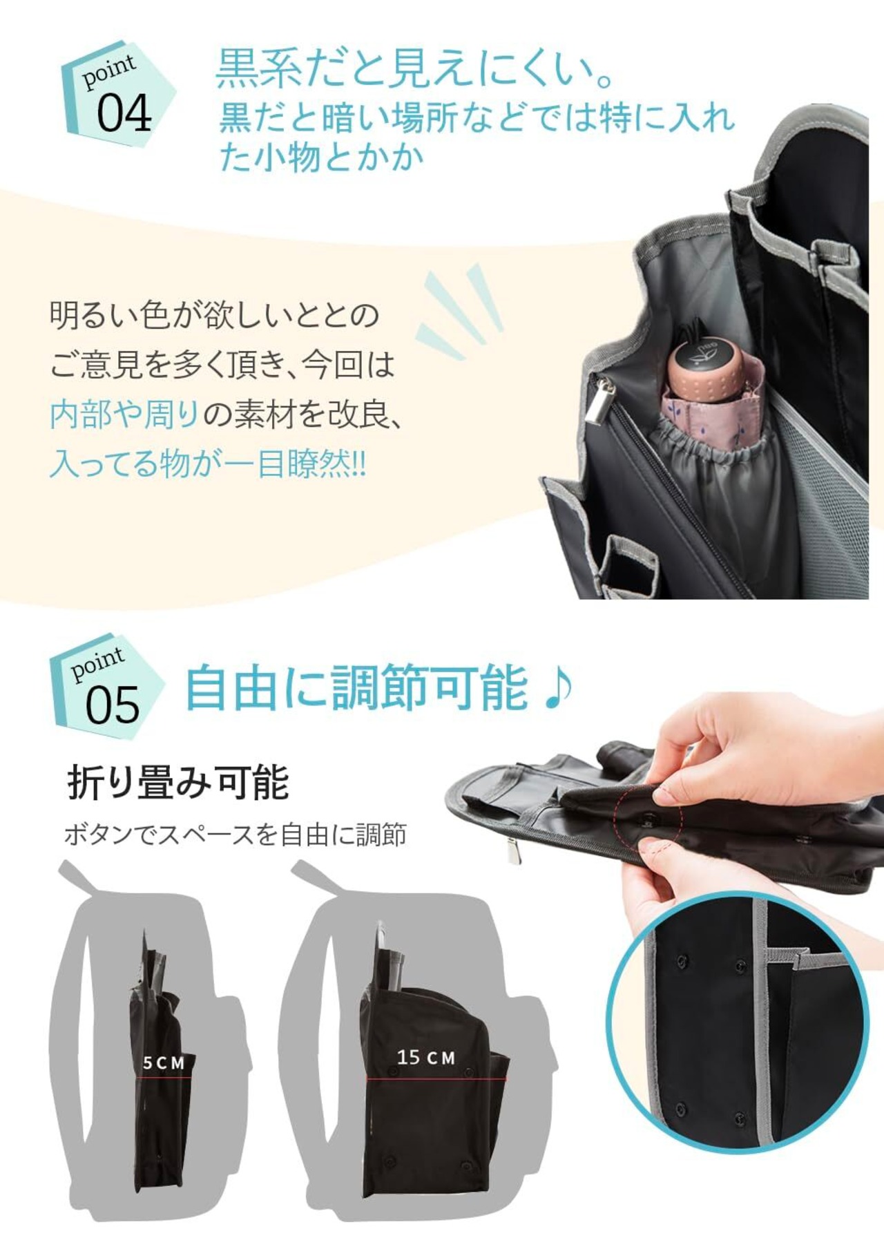 【様々な場所に大活躍】 作りがしっかりして多機能なので通勤の時だけでなく、買い物、ちょっとした旅行する時に収納バッグとしても大活躍です。携帯、手帳や化粧品など、すべての小物がきちんと直立して固定され、スムーズに取り出せます。