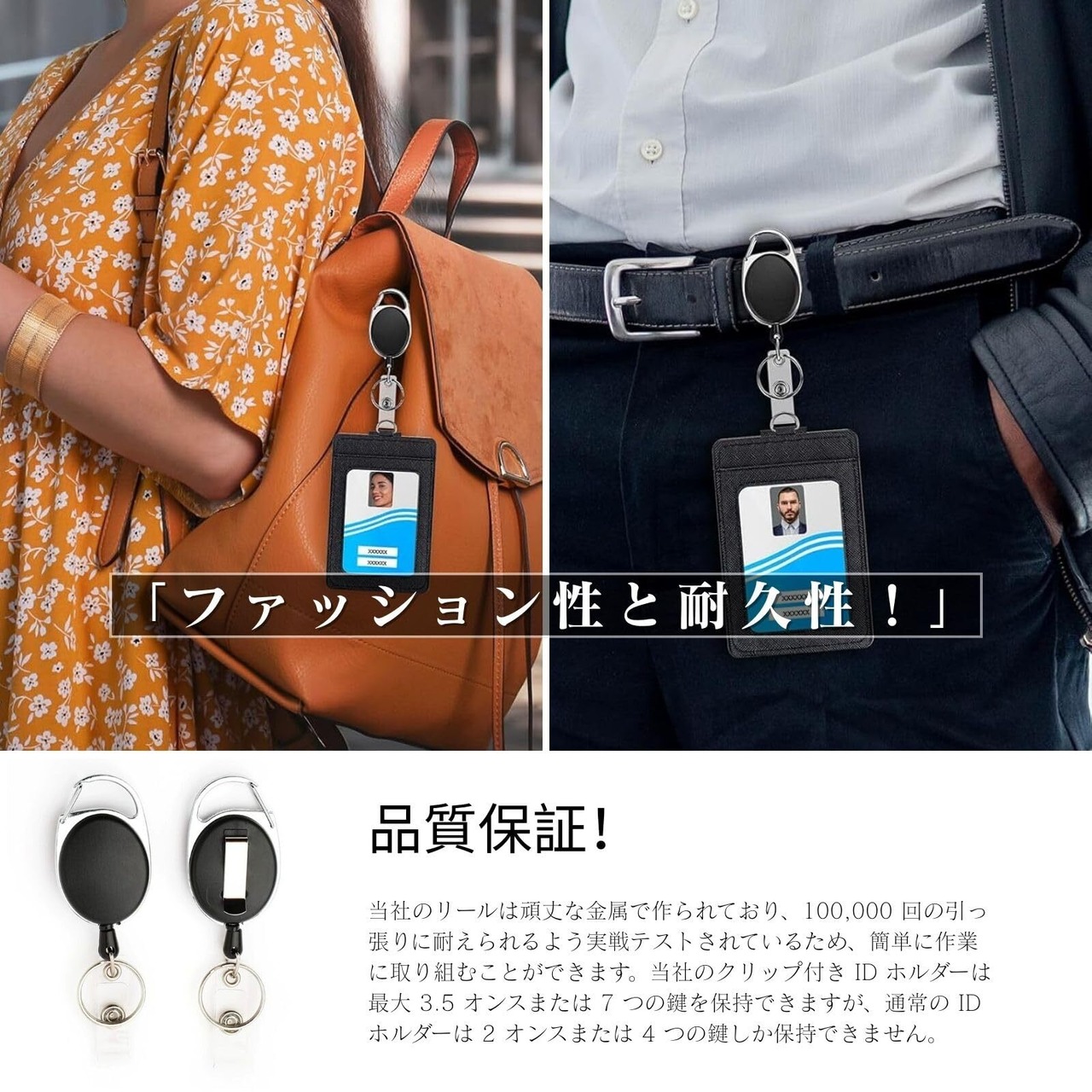 定期入れ リール付き パスケース メンズ レディース 脱落防止バンド付き 子供 男女兼用 縦 定期入れ リール 伸縮 両面3枚 ic カードケース 社員証 PUレザー (ブラック)