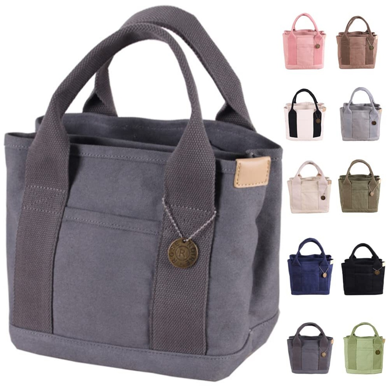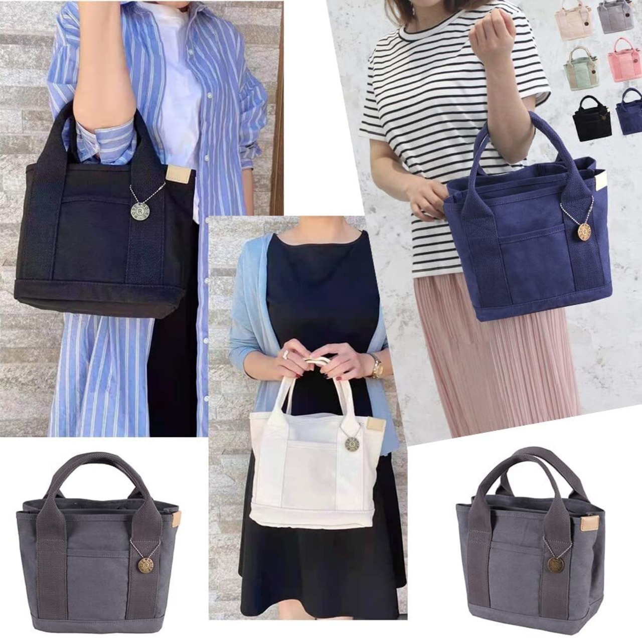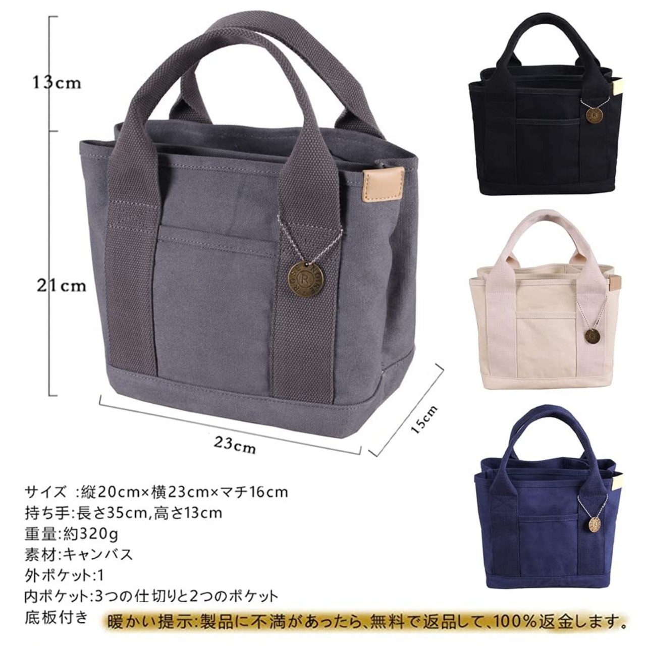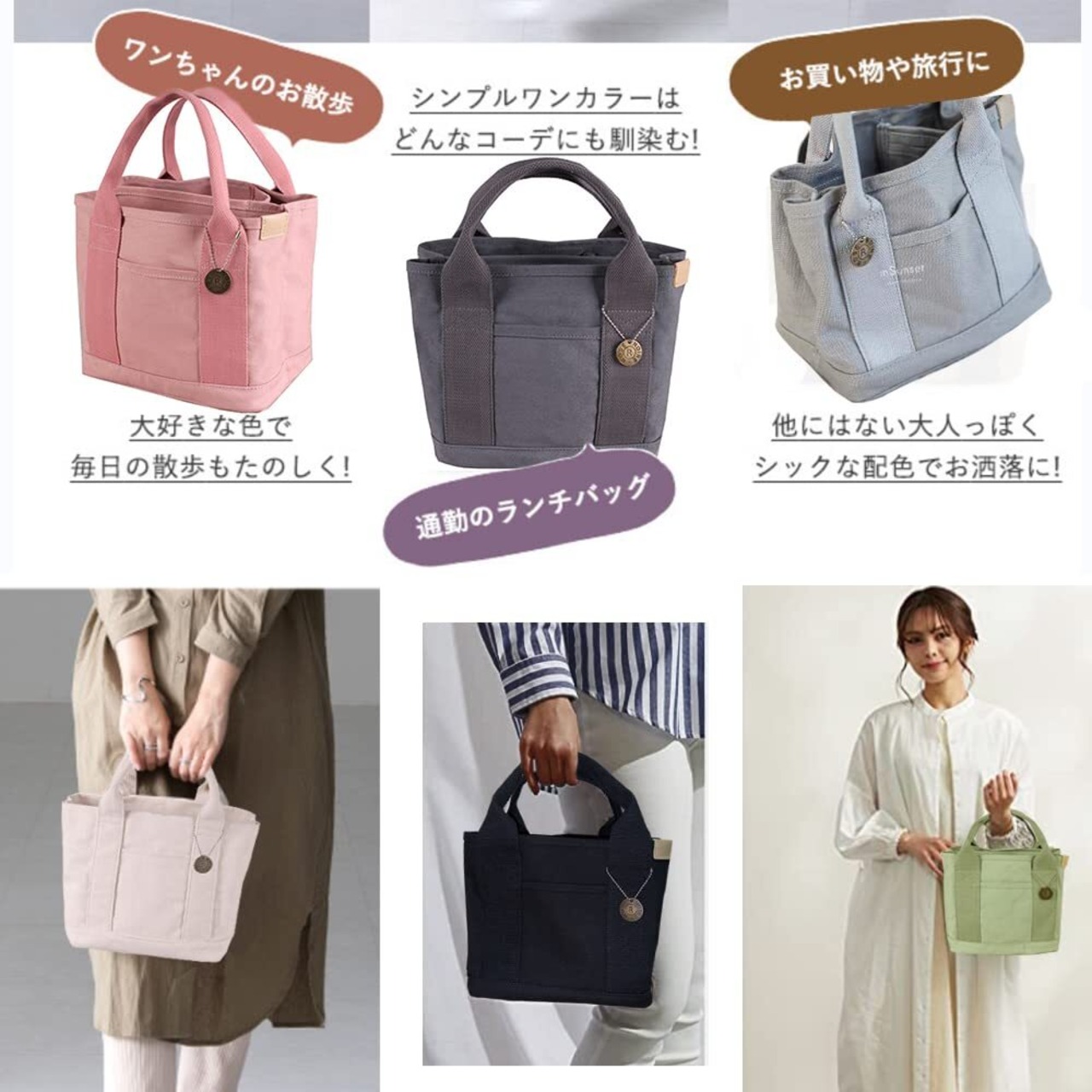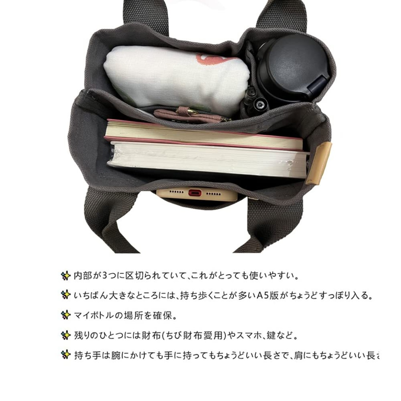 ヒント:外にはもう一つのポケットがあります。鍵、携帯などを置くことができます。ミニ トートバッグはお弁当箱やペットボトルがすっぽり入り、ランチバッグにピッタリ。