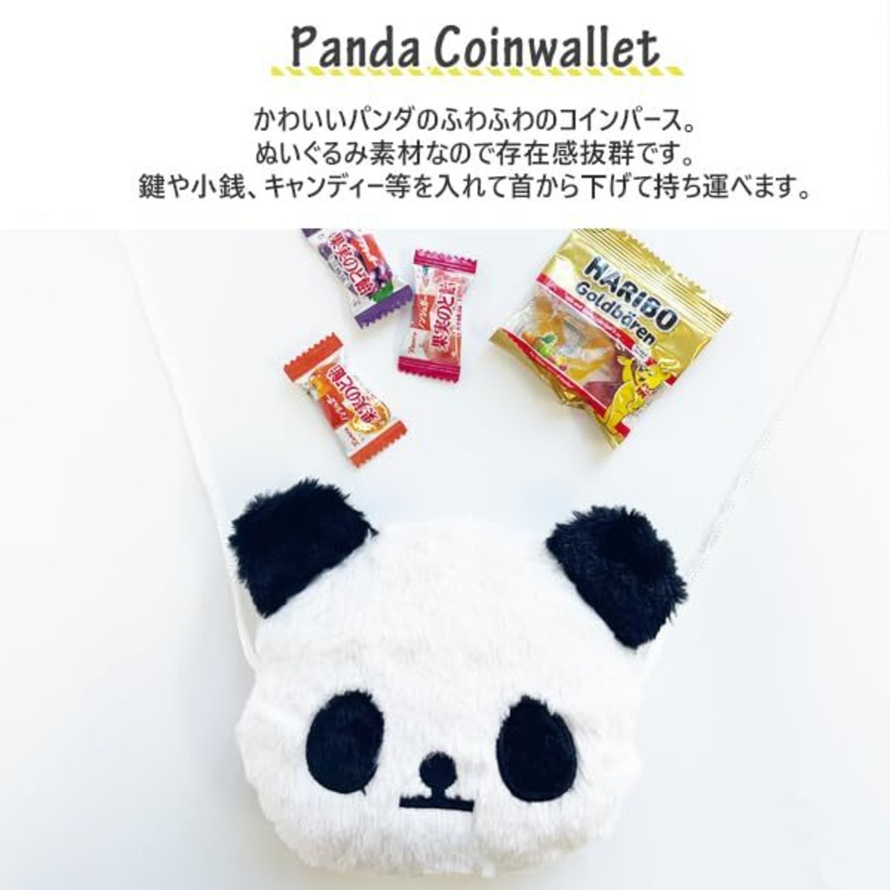 パンダフェイスが可愛い小物収納ポーチ。首から吊り下げられるネックポーチ仕様。