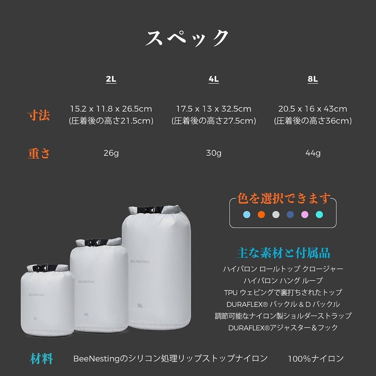 真の超軽量&高耐久 - 3サイズ合計でも重さわずか90g、軽量で快適に持ち運ぶことができ、ほとんどスペースを取りません。20D引き裂き防止ナイロン素材は、裏部分にハイタッチ防水膜でラミネート加工を施し、全体の強度と素材の修復力を高めています。
