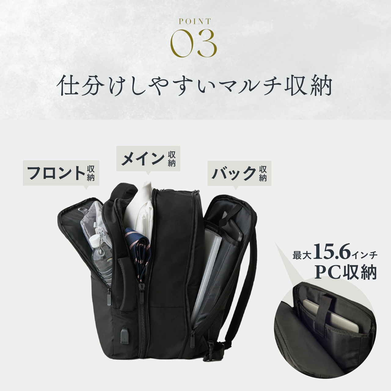 【充実の収納力と機能】 ビジネスマンの必需品に合わせた用途別ポケットが充実。 ・16インチPCまで対応可能なPCポケット(保護クッション付き) ・中には取り出しやすいフリーポケット、貴重品収納に便利なファスナー付きポケットを完備 ・前面には、必要なものをさっと取り出せるフロントポケットあり ノートPCから細かいものまで、これ1つで整理整頓が叶います。 また、マチが12.5cmから22.5cmに拡張可能なため、 荷物が多い日や出張時などもこれひとつでOK。移動を考え、機内持ち込みにも便利なキャリーオン機能を搭載。旅行などでも活躍すること間違いなしです。