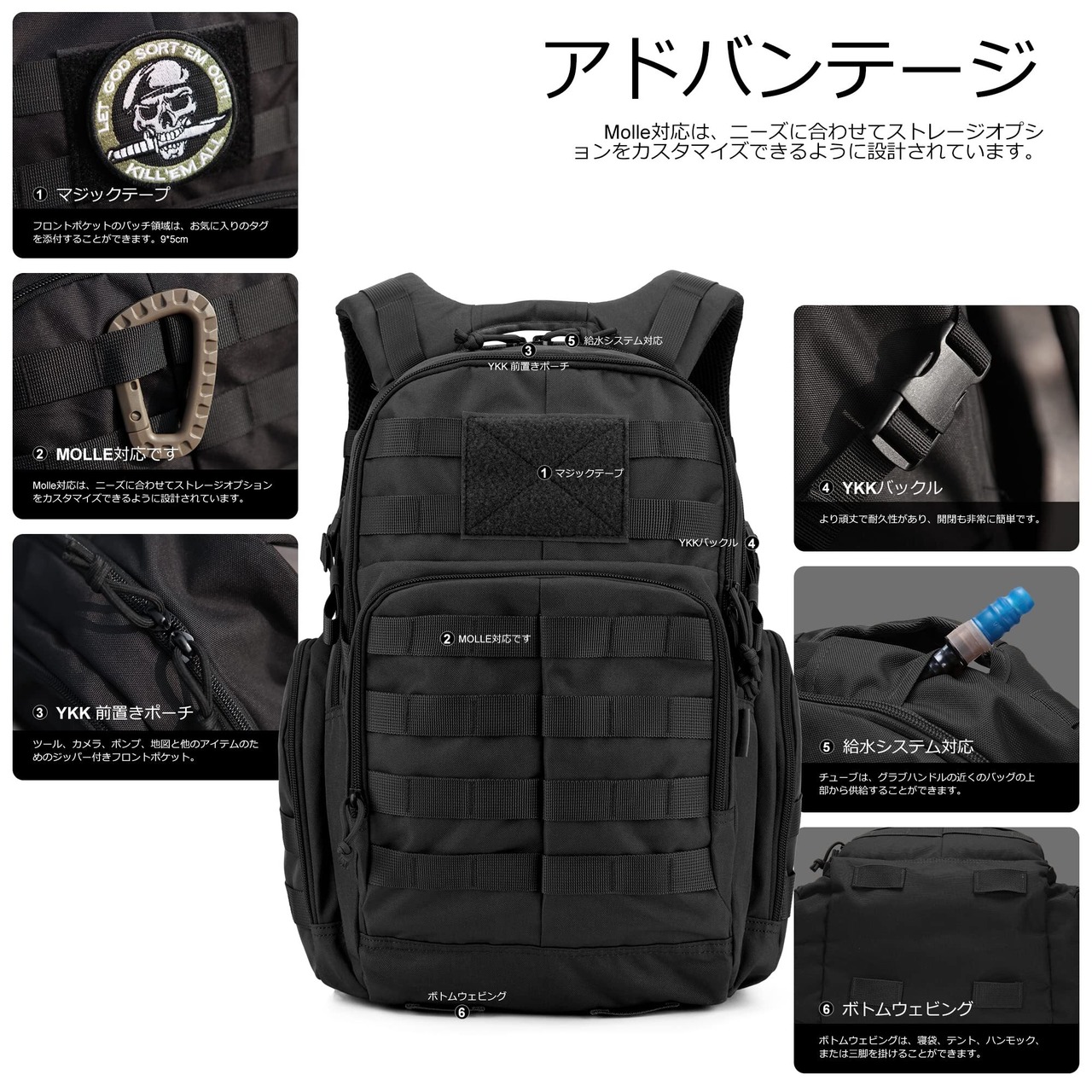 【耐久性と多機能性】このmolleバックパックは、1-2日間のアサルトパック、バグアウトバッグ、サバイバルバックパック、軍用バックパック、トレッキングバックパックまたはデイパックとして使用できるように、重量に対応する胸ストラップ付きです。 ハイキング、キャンプ、トレッキング、旅行、学校または日常使用のためのスーツ。
