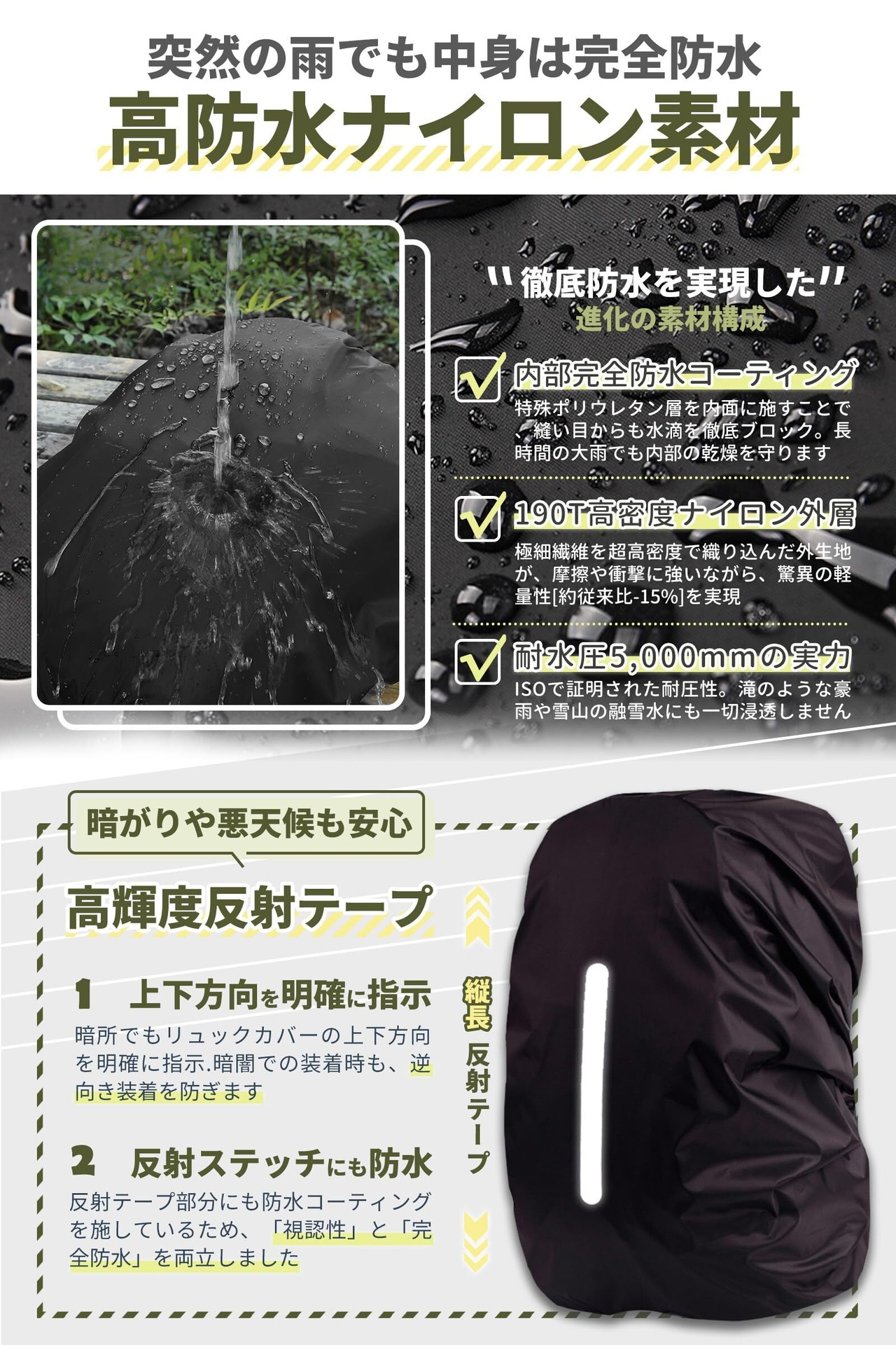 【雨の日・夜間も安心】高防水ナイロン素材(耐水圧2000mm)で、突然の雨でも中身は完全防水!さらに背面には縦長の高輝度反射ステッチを施した防水カバーで、暗がりや悪天候でも視認性バツグン