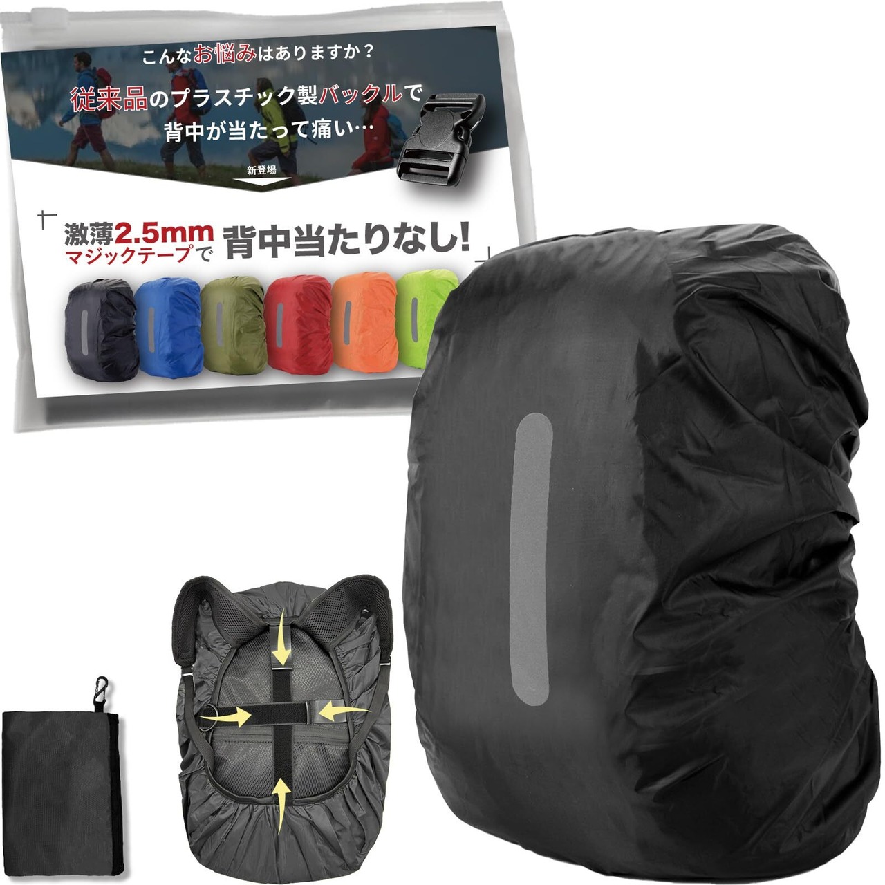 このリュックカバーは、超薄型マジックテープ(2.5mm)を採用し、従来の硬いバックル(9mm)と比べて背中に当たらない設計。長時間の背负いでもストレスフリーです。十字型固定ベルトデザインで強風の中でもリュックをしっかりロックし、上部までピッタリ覆うザックカバーだから、登山から通勤・通学まであらゆるシーンで安定感が抜群。高防水ナイロン素材(耐水圧2000mm)を使用しているため、突然の雨でも中身は完全防水。背面には縦長の高輝度反射ステッチを施し、暗がりや悪天候でも視認性バツグンです。さらに、サビに強い合金製サイドフックで傘や水筒を簡単に掛けられ、収納可能なポーチ(S字フック付き)でレインカバーをサッと出し入れ可能。使い勝手の良さも特徴です。全6サイズ×6カラー展開(収納ポーチ同色)で、サイズ選びに迷った場合は商品ページの目安表を参考にしてください。万が一合わなくても返品・交換に対応しています。