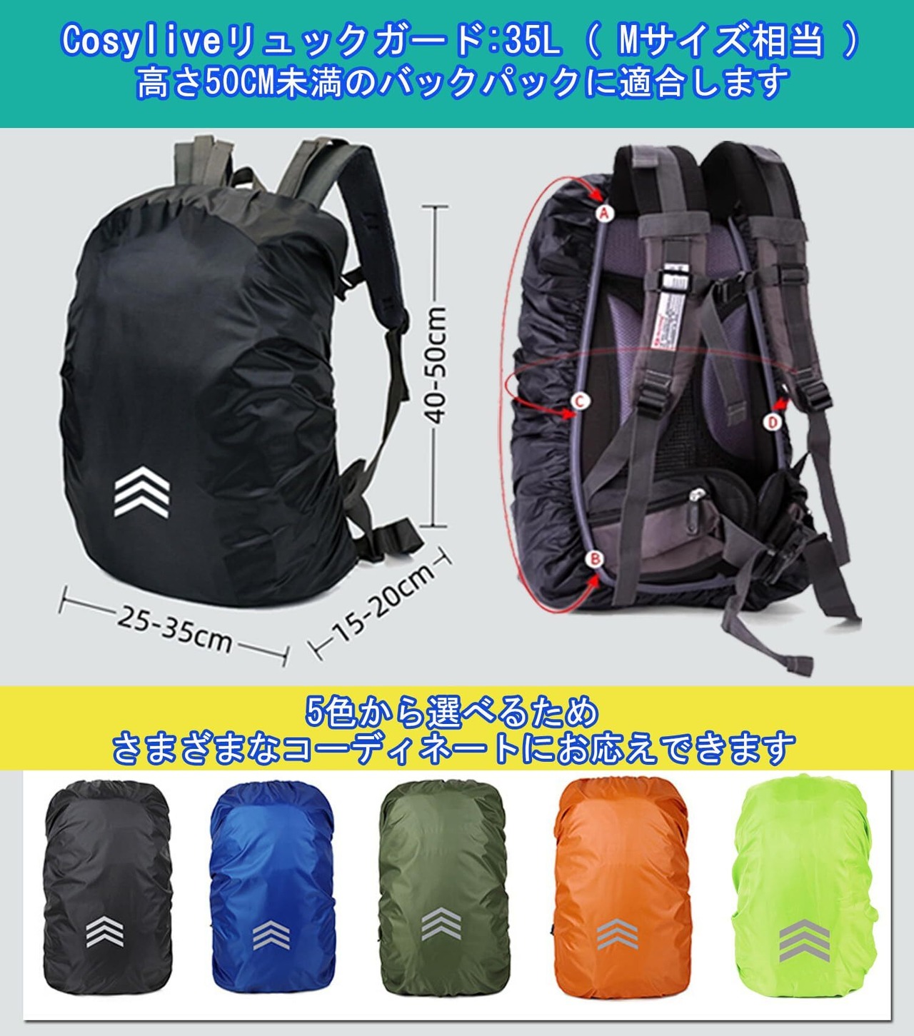 【商品仕様】Cosyliveのリュック防水レインカバーのサイズはM: 35Lで、一般的な子ども用リュック、カジュアルバッグ、ノートPCバッグ、およびアウトドア用トレッキングバッグなどに対応しています。雨よけ ザックカバーには引きひも付きの防水収納袋が付属しており、バックパックに取り付けられて簡単に収納でき、軽量かつ携帯性が高いです。リュック レインカバーのカラーはブラック、ブルー、ミリタリーグリーン、蛍光グリーン、オレンジの5色から選べるため、さまざまなコーディネートにお応えできます。