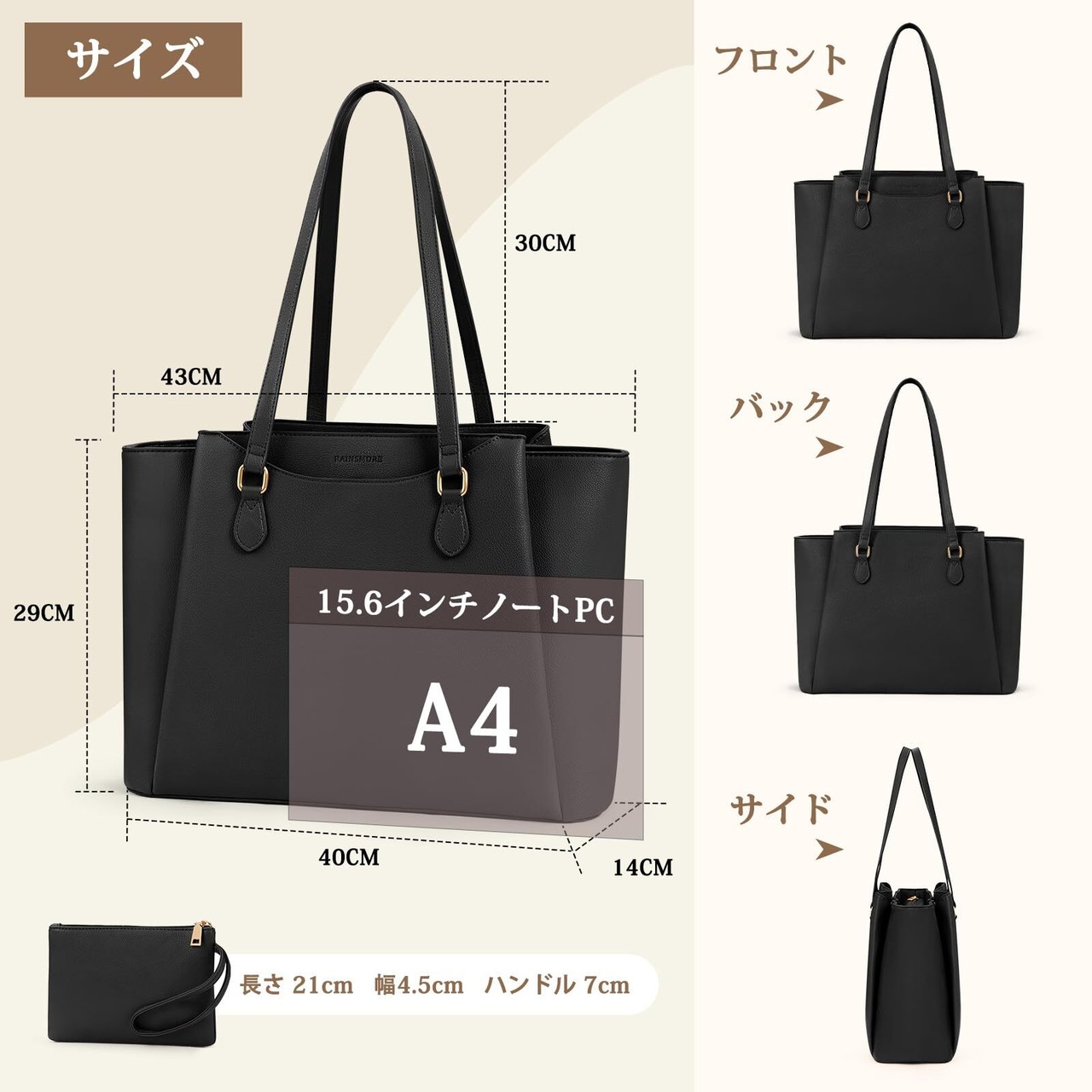 本製品は、洗練されたデザインと高品質なPUレザーを採用した、エレガントで多機能なバッグです。シンプルながら上品なフォルムは、ビジネスシーンはもちろん、カジュアルな日常使いにもぴったりで、就活、通勤、出張、旅行、デート、ショッピング、カラオケ、ウォーキングなど、あらゆるシーンで活躍します。大容量設計により、A4サイズの書類や15.6インチのノートPCはもちろん、iPad、財布、手帳、水筒、スマートフォン、折りたたみ傘、化粧品など日常の必需品を効率よく整理収納できます。外部にはマグネット式ポケットが3つ搭載され、頻繁に取り出すアイテムをサッと収納可能なほか、独立したミニポーチも付属しており、小物の整理にも便利です。さらに、底面には4つの鋲が付いているため、直置きしても傷や汚れを防ぎ、自立構造に常に美しいシルエットを保ちます。スムーズで耐久性に優れたファスナーと、忙しい日常でも快適にお使いいただけます。持ち手の長さは30cmで、手持ち・肩掛けどちらでもシーンに応じて使用可能。シンプルでありながらエレガントなデザインは、プロフェッショナルな女性の装いを引き立てると同時に、贈り物としても最適な一品です。