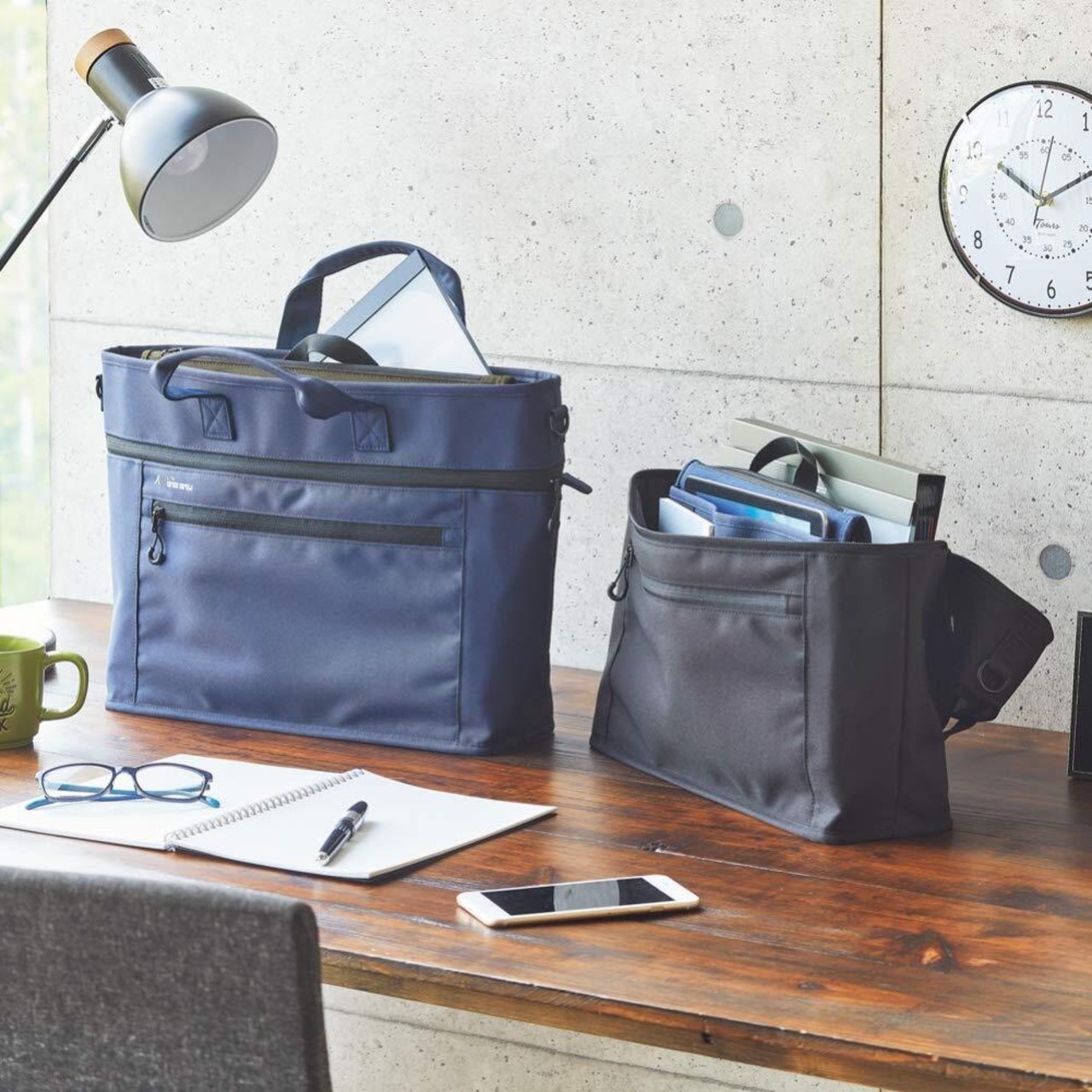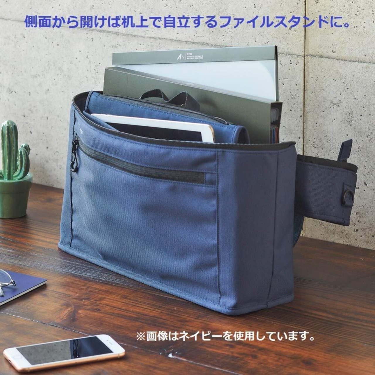 側面から開けば、机上で自立しファイルスタンドとしても使えるビジネスバッグ。