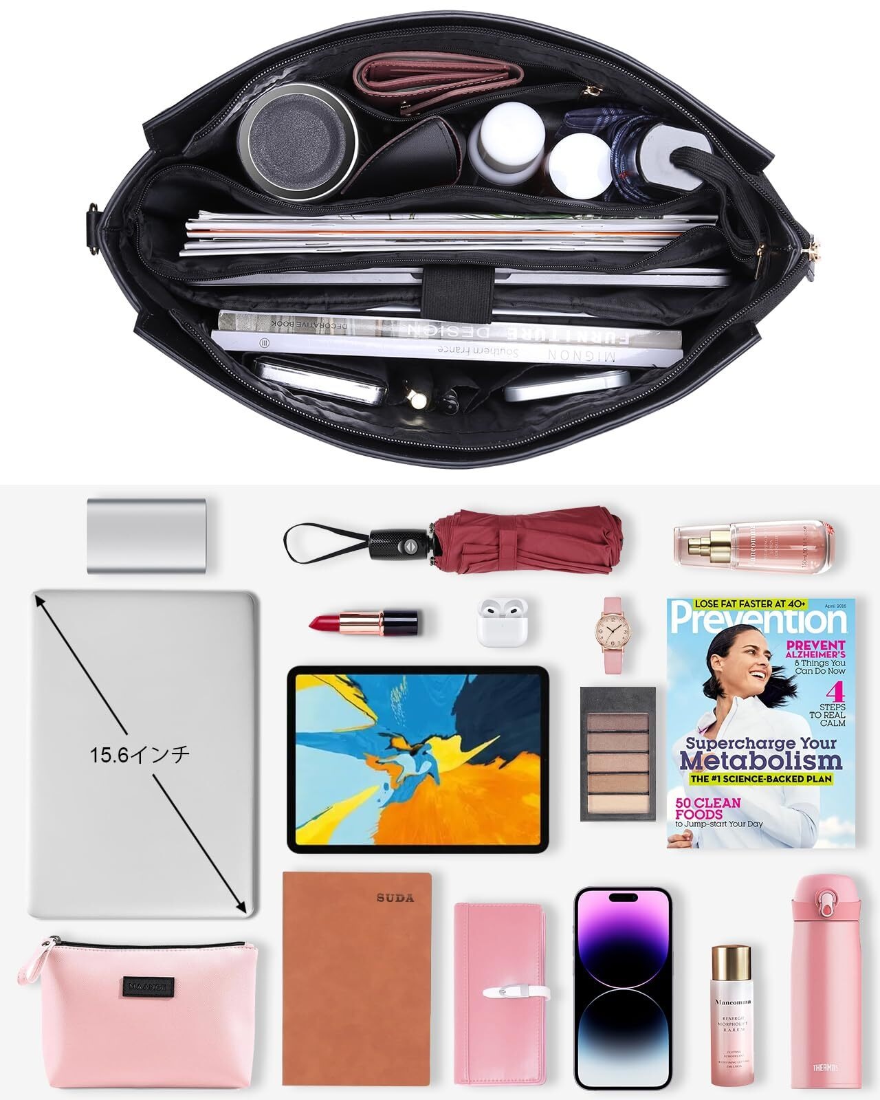 「大容量&収納力抜群」注意:旧バージョンでいただきましたお客様の声をすべて反映して大幅改良しました。(改良点:手持ち部分の縫製と検品の改良、丈夫で耐久性もあります。)このトートバッグサイズは:縦30cm×横40cm×幅14cm、重さ:905g。大容量のバッグなので、書類、雑誌、化粧品、ペットボトル、折り畳み傘、15.6インチPC、財布、手帳、A4ファイルなどがすべて収納できます。バッグの上部が幅広いデザインなので、ものの出し入れがしやすいです。また背面ポケットはファスナー付き、貴重品を入れても安心感があります。働く女性の通勤に欠かせないレディースビジネスバッグです。